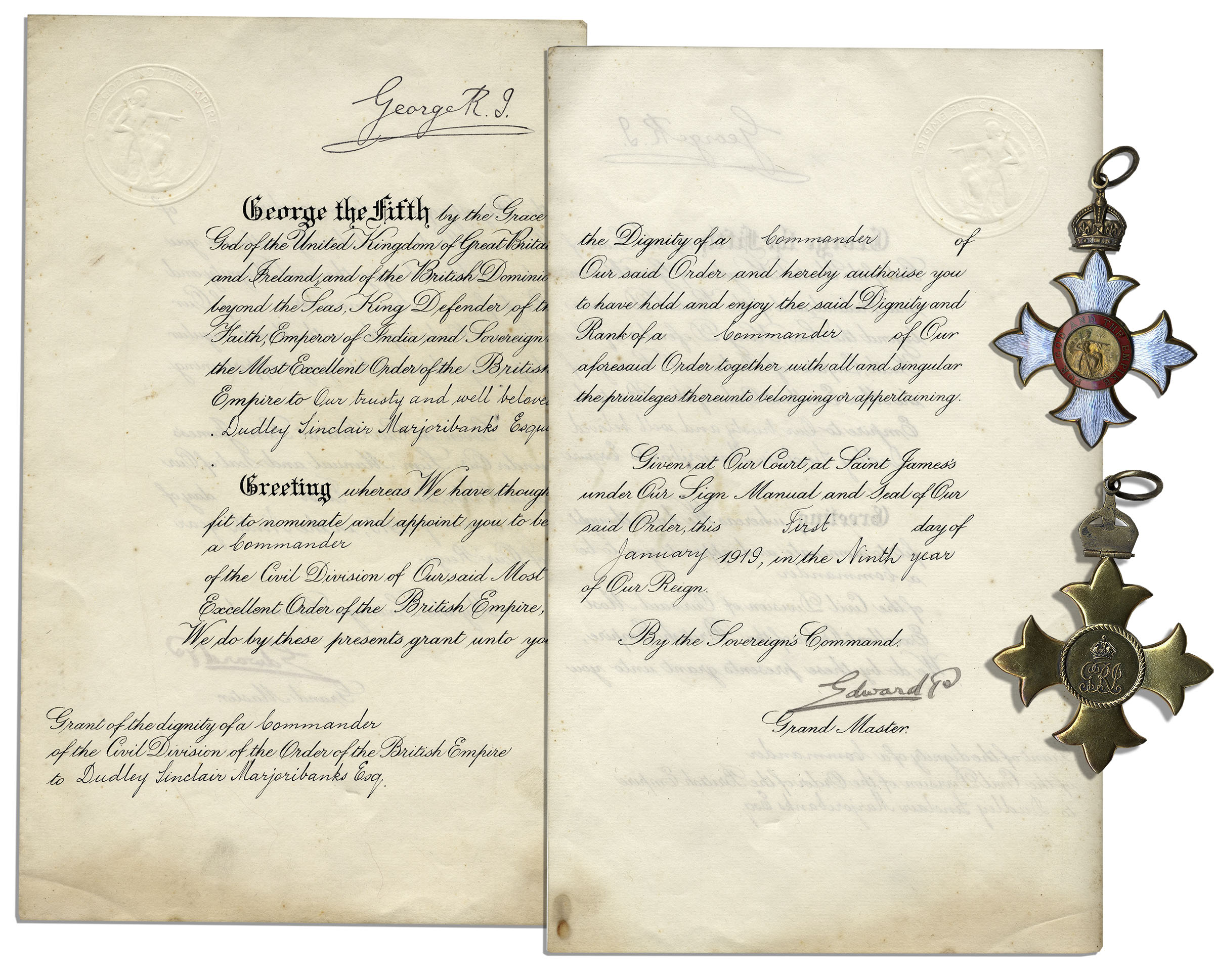 Medal honoring the Commander of The Most Excellent Order of the British Empire, accompanied by the bestowal document. Commanders’ breast badge is of the first type, made in the shape of a cross fleury with ice blue enamel over guilloche limbs. At the center is a gold or bronze medallion depicting an enthroned figure in profile with sun in the sky, surrounded by a red enamel border reading, ”For God And The Empire”. Medal is topped with an articulated openwork crown attached to a loop for suspending. Verso bears the monogram of George V as ”G.R.I.”, George Rex Imperator. Accompanied by its 12” x 1.75” purple grosgrain ribbon and document bestowing the medal on the new commander, Dudley Sinclair Marjoribanks, Esq., with facsimile signature of George and signed on the second page, ”Edward P”. Medal measures 2.5” x 3.75”. Near fine. Ribbon shows fraying to the top, else near fine. Document runs 2pp. on a sheet of card-style stationery, measuring 8” x 12.75”. Toning, else near fine. Sold for $1,511.