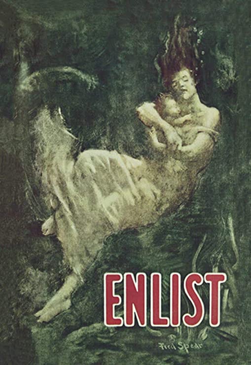 This World War 1 poster, illustrated by Fred Spear, was published in June 1915 by the Boston Committee of Public Safety, after the sinking of the Lusitania by a German U-boat attack. More than a thousand civilians were lost, 128 of them American. Spear’s poster recalls the drowning of a mother and child. Without the particular occasion and the word ‘Enlist,’ the dreamlike image of two figures under the sea would arouse no strong response.