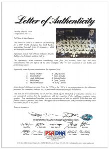 Signed 10″ x 8″ photo depicting the 1937 World Champion New York Yankees and bearing 30 signatures, accounting for every uniformed subject pictured. The signatures are rendered in the same consistent black fountain pen and include Lou Gehrig, Joe DiMaggio, Red Ruffing, Selkirk, Crosetti, Jorgens, Hoag, Scheiber, Henrich, Hadley, Andrews, Makosky, Murphy, Rolfe, Vance, Malone, Glenn, Fletcher, Powell and Sullivan (mascot). Ten of the signatures are clubhouse versions including Wicker, Heffner, Saltzgaver, Dickey, Pearson, Gomez, Schulte, McCarthy, Combs and Lazzeri. Very good dark, legible signatures. Light wear, otherwise excellent. Accompanied by PSA/DNA COA. Sold for $3,670.