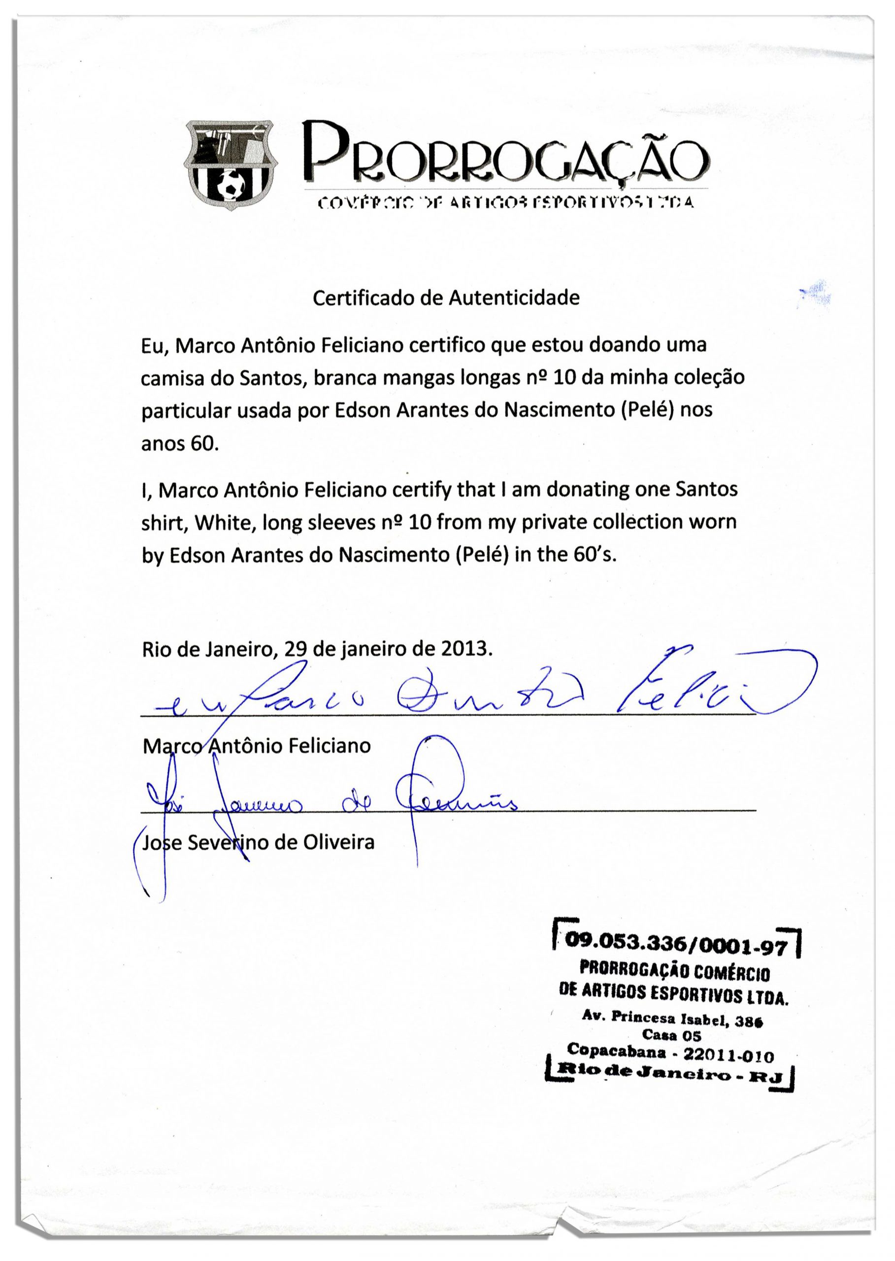 Brazilian soccer superstar, Pele worn Santos jersey from the 1960’s, the Golden Era of the team. White long-sleeve collared jersey features the team’s ”S.F.C.” logo patch on left breast and also has his team number ”10” stitched in blue to verso. ”Ceppo” brand tag still intact. Cotton shirt has no size, though 20” shoulder-to-shoulder x 30.5”. With brown flecks of dirt stains throughout, possibly from game-use. Includes a ”Prorrogacao” COA from Pele’s Brazil teammate: ”I, Marco Antonio Feliciano certify that I am donating one Santos shirt, white, long sleeves, no. 10 from my private collection worn by Edson Arantes do Nascimento (Pele) in the 60’s.” Also includes a 2005 Brazilian ”Botafogo” magazine issue and a photo of Feliciano signing the COA. Sold for $4,813.