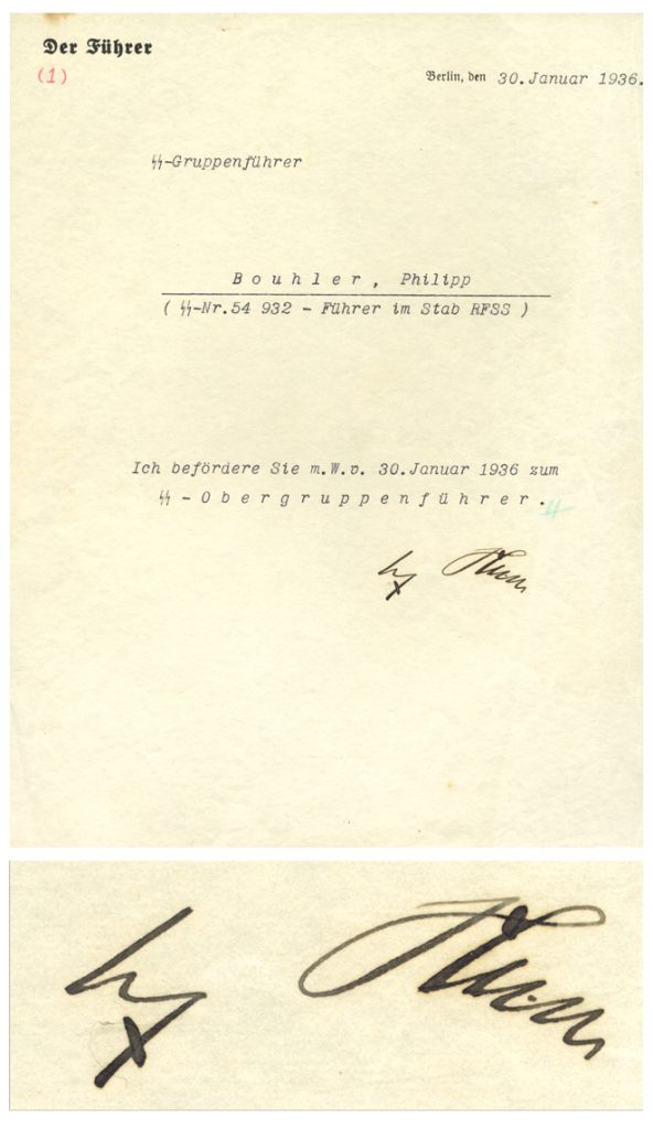 Adolf Hitler signed document, composed upon his personal Berlin stationery, with ”Der Fuhrer” at upper left. Dated 30 January 1936, Hitler promotes Philipp Bouhler to the position of Head Group Leader, or ”Obergruppenfuhrer”, the highest commissioned rank in the SS at that time. Bouhler was one of the first members (#12) of the Nazi party and one of the leaders of the Beer Hall Putsch in 1923, when Hitler and his cohorts attempted to overthrow the Bavarian government by gunpoint. Bouhler would ultimately be appointed as one of the few Reichsleiters and as Chief of the Chancellery for Hitler where he led the infamous T4 program. Document measures 7.375” x 9.675”, accompanied by a sheet of German stamps bearing Hitler’s image. Light discoloration and creasing, overall in near fine condition with a dark and clear signature. With a COA from R.M. Smythe. Sold for $2,218.