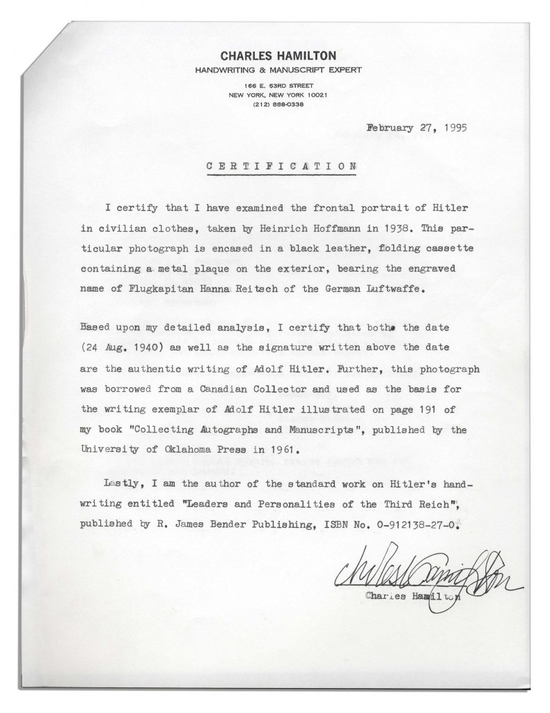 Very rare Hitler signed and dated photo, dated 24 August 1940. Photo is matted and framed in a sturdy black cassette presumably that once belonged to Nazi aviator Flugkapitan Hanna Reitsch, the only woman awarded the Iron Cross First Class and the Luftwaffe Pilot/Observer Badge in Gold with Diamonds during World War II. Her name is engraved to plaque affixed to cover of case. Photo depicts Hitler posing sternly, seated on a chair in a non-military suit. With date inscribed along bottom in German along with his ”Adolf Hitler” signature in black ink. Framed with a metal plaque of the Nazi party emblem, the eagle atop the swastika symbol, opposite photo against red plush fabric matting. With provenance from Charles Hamilton, handwriting and manuscript expert. Letter reads in full, ”I certify that I have examined the frontal portrait of Hitler in civilian clothes, taken by Heinrich Hoffmann in 1938. This particular photograph is encased in a black leather, folding cassette containing a metal plaque on the exterior, bearing the engraved name of Flugkapitan Hanna Reitsch of the German Luftwaffe. Based upon my detailed analysis, I certify that both the date (24 Aug. 1940) as well as the signature written above the date are the authentic writing of Adolf Hitler. Further, this photograph was borrowed from a Canadian Collector and used as the basis for the writing exemplar of Adolf Hitler illustrated on page 191 of my book ‘Collecting Autographs and Manuscripts’, published by the University of Oklahoma Press in 1961. Lastly, I am the author of the standard work on Hitler’s handwriting entitled ‘Leaders and Personalities of the Third Reich”’. Photo measures 6.5” x 7.5”; black case measures 7.25” x 8.25” with some minor wear to case, else near fine. Sold for $11,250.