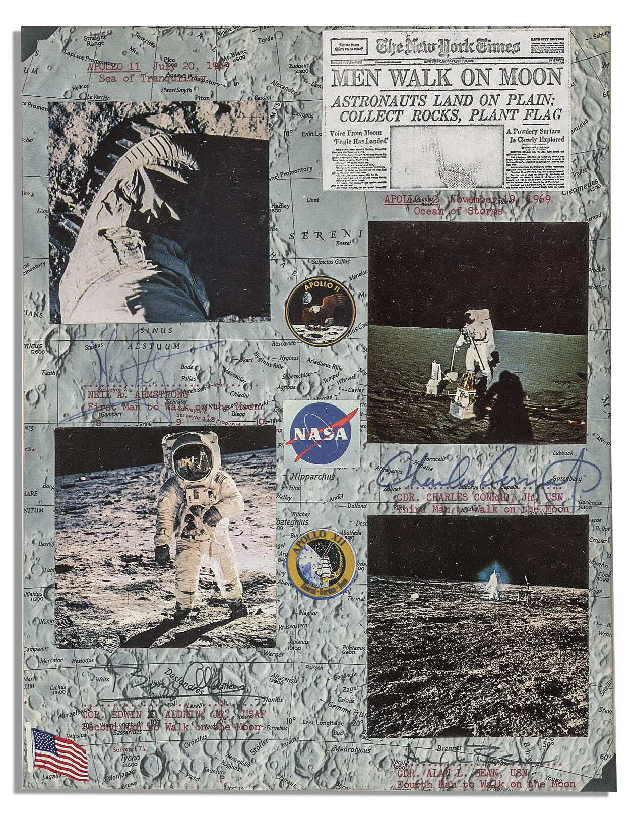 Apollo 11 & 12 moonwalkers Neil Armstrong, Charles “Pete” Conrad, Buzz Aldrin and Alan Bean signed collage. Apollo-themed collage has a backdrop of the map of the moon and includes photos from the missions, mission logos, and a clipping from a New York Times paper headlining the lunar walk. Each astronaut signs his name beneath one of the four photos. Collage measures approximately 8″ x 10″ on one sheet. Overall, near fine. Sold for $1,875.