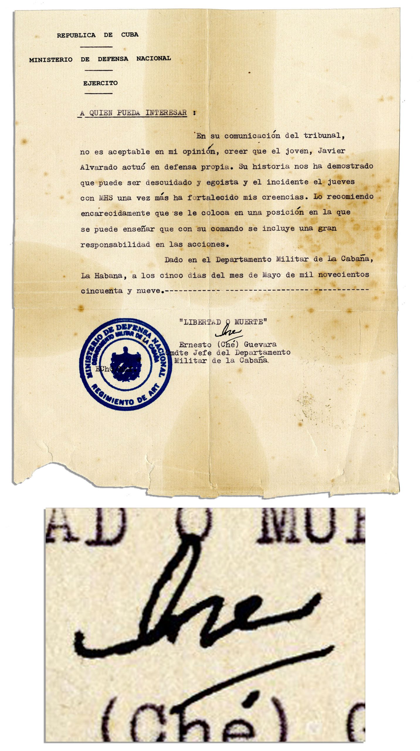 Excellent Che Guevara typed letter signed as Chief of the Cuban Military, with content regarding inappropriate behavior of one of his lieutenants. On Cuba’s National Defense Ministry stationery, Guevara writes on 5 May 1959 critiquing the conduct of a young man named Javier Alvarado. Spanish-language letter translates to: ”…In its communication of the court, is not acceptable in my opinion, to believe that the young lieutenant, Javier Alvarado acted in self defense. His history has shown that he can be careless and selfish and the incident on Thursday with MHS has once again strengthened my beliefs. I highly recommend that you put him in a position where he can be taught that his command includes a large responsibility for his actions…” Stamped with a Cuban Ministry of Defense seal. Single page measures 8.25” x 10.5”. Foxing, toning and chipping along bottom edge. Good to very good condition. Sold for $1,720.