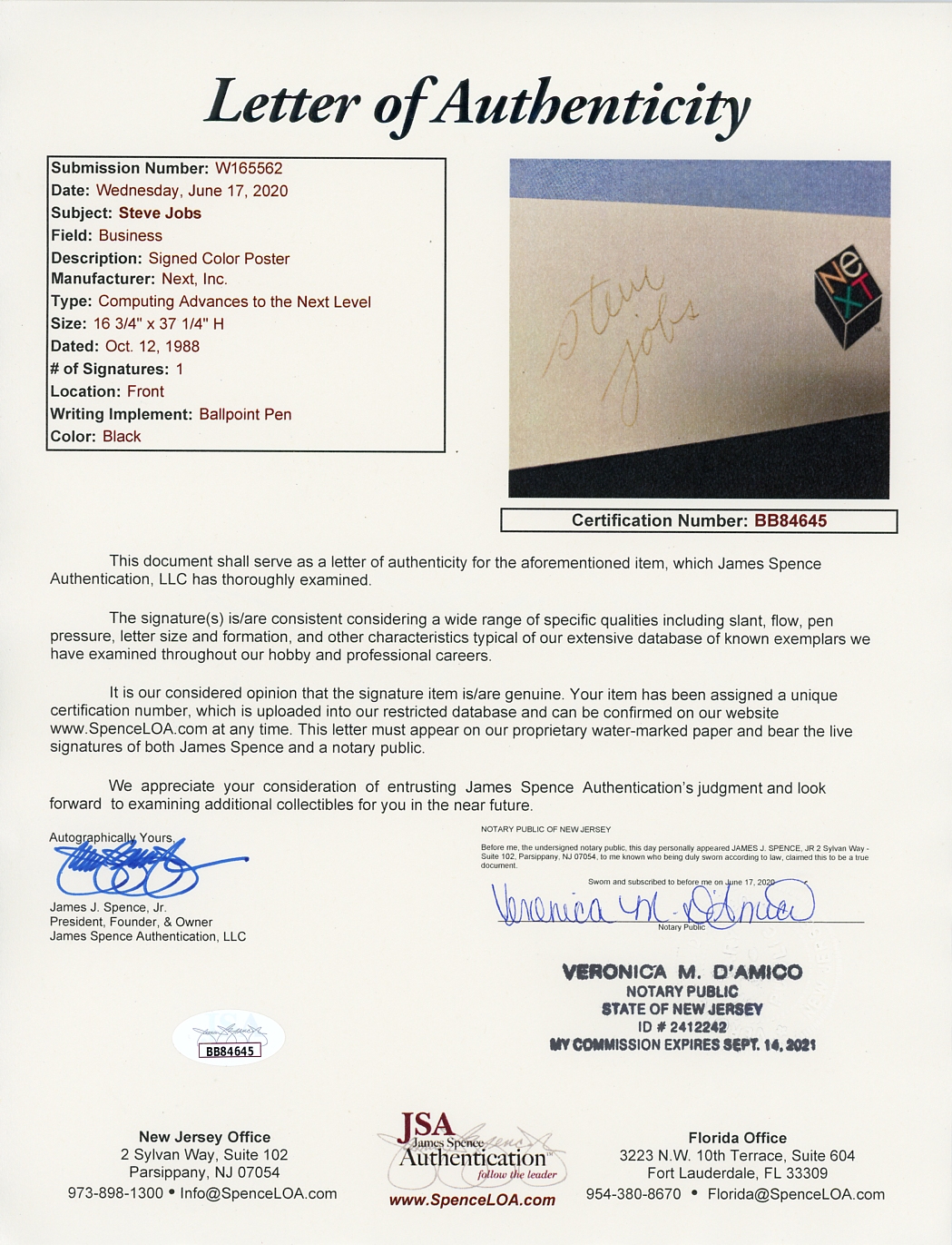 Scarce NeXT Computer poster signed by Steve Jobs, who founded NeXT in 1985 after he was forced out of Apple. The NeXT Computer System was the first line of products released by the company, which debuted to the world at the invitation-only NeXT Introduction on 12 October 1988, where this poster was displayed and signed by Jobs. In his first major public appearance since leaving Apple, he famously told the audience, “It’s great to be back.” Poster on foam board measures 37.25″ x 16.75″, signed by Jobs at lower right margin. Fading to signature, otherwise near fine condition. With an LOA from the consignor, who received the poster from her employer who worked directly with Jobs. With JSA COA. Sold for $12,974.