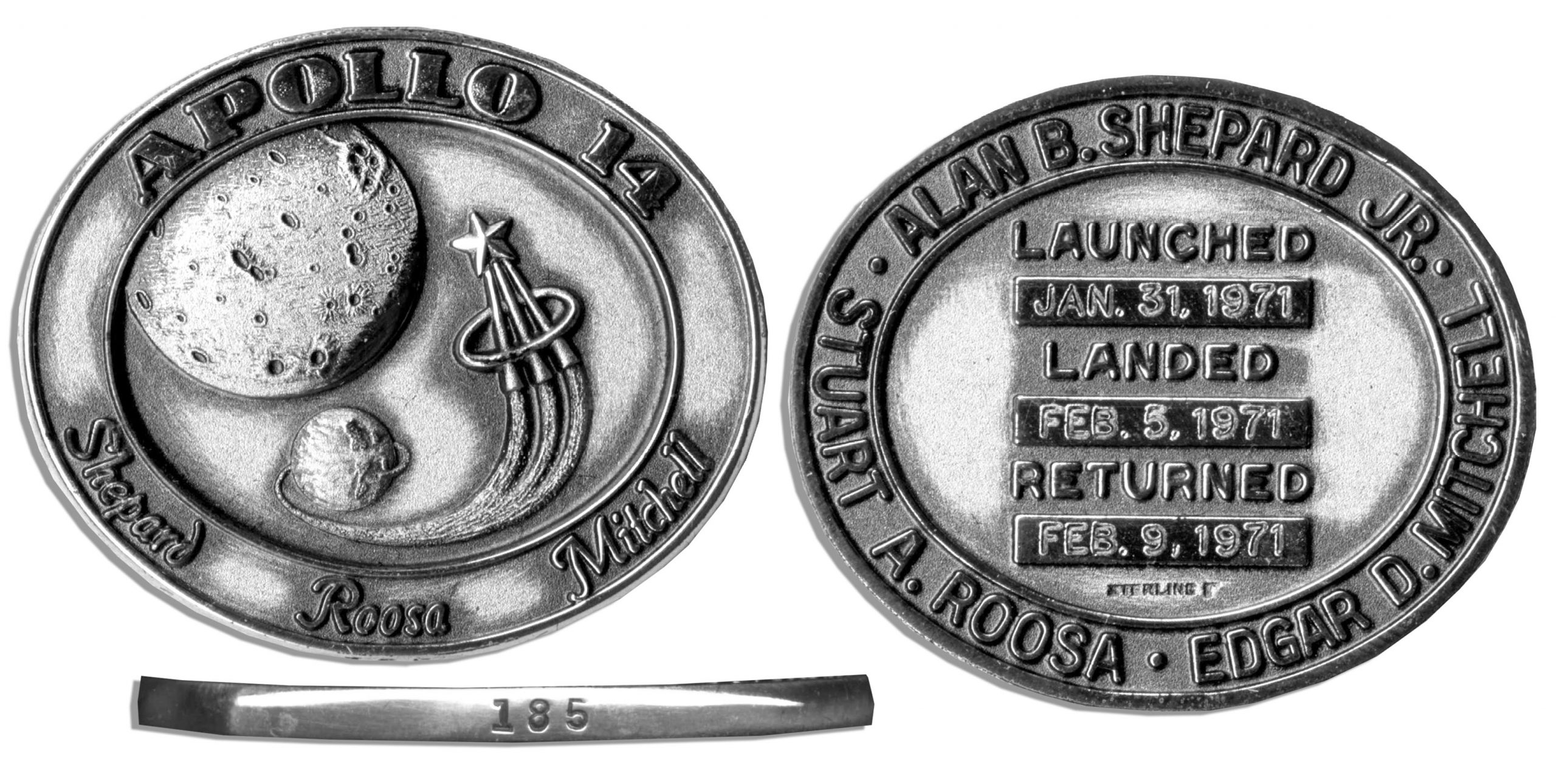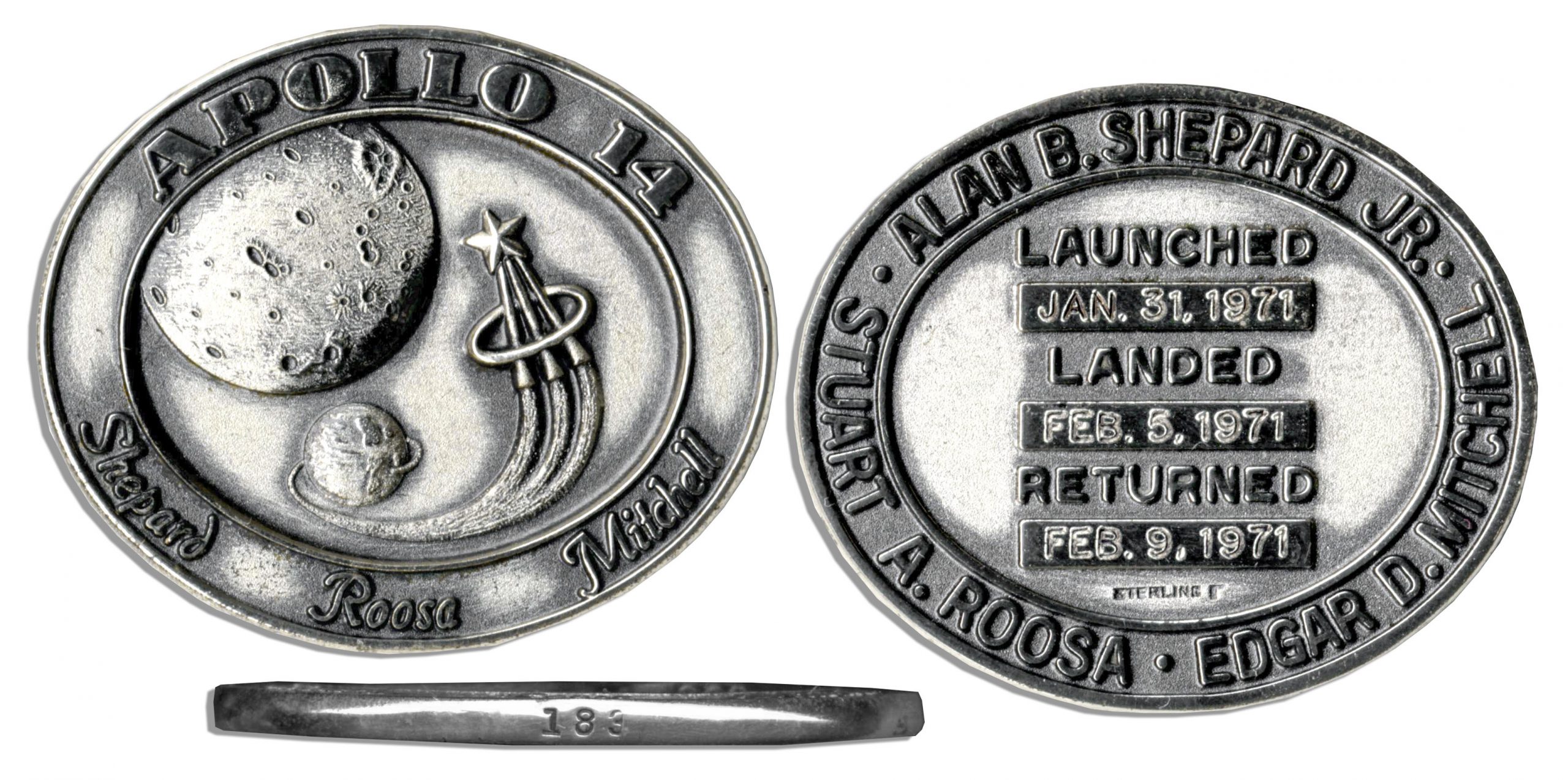 Apollo 14 Robbins medal, serial number 183, as one of 303 flown. Collectively, crewmembers Alan Shepard, Stuart Roosa, and Edgar Mitchell helped complete a successful 9-day lunar mission commencing 31 January 1971, as the eighth manned mission in the Apollo program and the third mission to land on the Moon. Oval medal features an emblem of the NASA astronaut pin, a star, given to U.S. astronauts upon completing their first space flight, and here, shooting through space toward the moon. Each astronaut’s last name is depicted along bottom edge. Verso lists launch, landing and re-entry dates along with the Robbins sterling silver hallmark. Serial number ”183” is engraved along edge. Coin measures 1.25” and is made of sterling silver, housed in its original ”Robbins Company” plastic box with an ”183” sticker on the bottom. Fine. With an LOA from Apollo 13 astronaut Jack Swigert’s sister. Sold for $5,000.