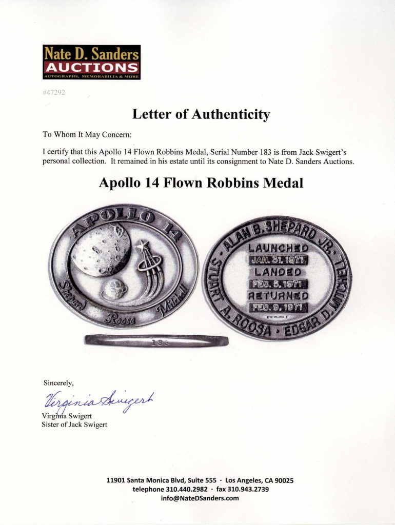 Jack Swigert’s Personally Owned Apollo 14 Flown Robbins Medal, Serial Number 183