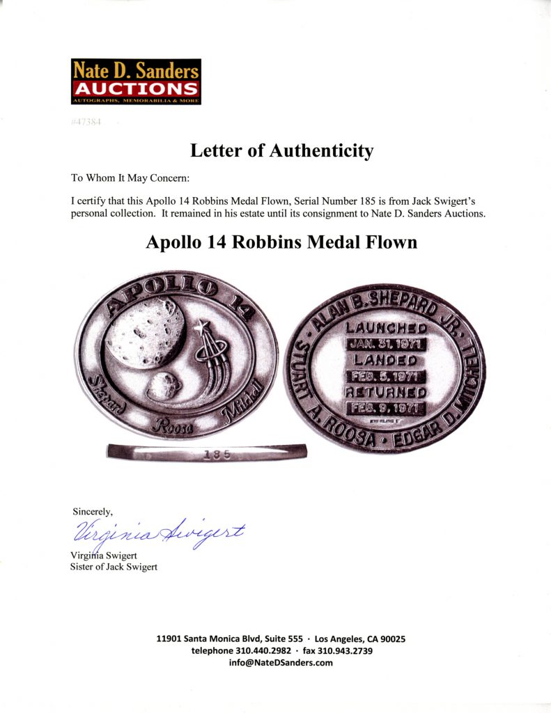 Apollo 14 Robbins medal, serial number 184, as one of 303 flown. Oval medal features an emblem of the NASA astronaut pin, a star, given to U.S. astronauts upon completing their first space flight; here, it shoots through space toward the moon. “Apollo 14” is also engraved along rim, along with each crew member’s name. Verso lists launch, landing and re-entry dates along with the Robbins sterling silver hallmark. Serial number “184” is engraved along edge. Coin measures 1.25” and is made of sterling silver, housed in its original ”Robbins Company” plastic box with an “184” sticker on the bottom. Fine. With an LOA from Apollo 13 astronaut Jack Swigert’s sister. Sold for $10,500.