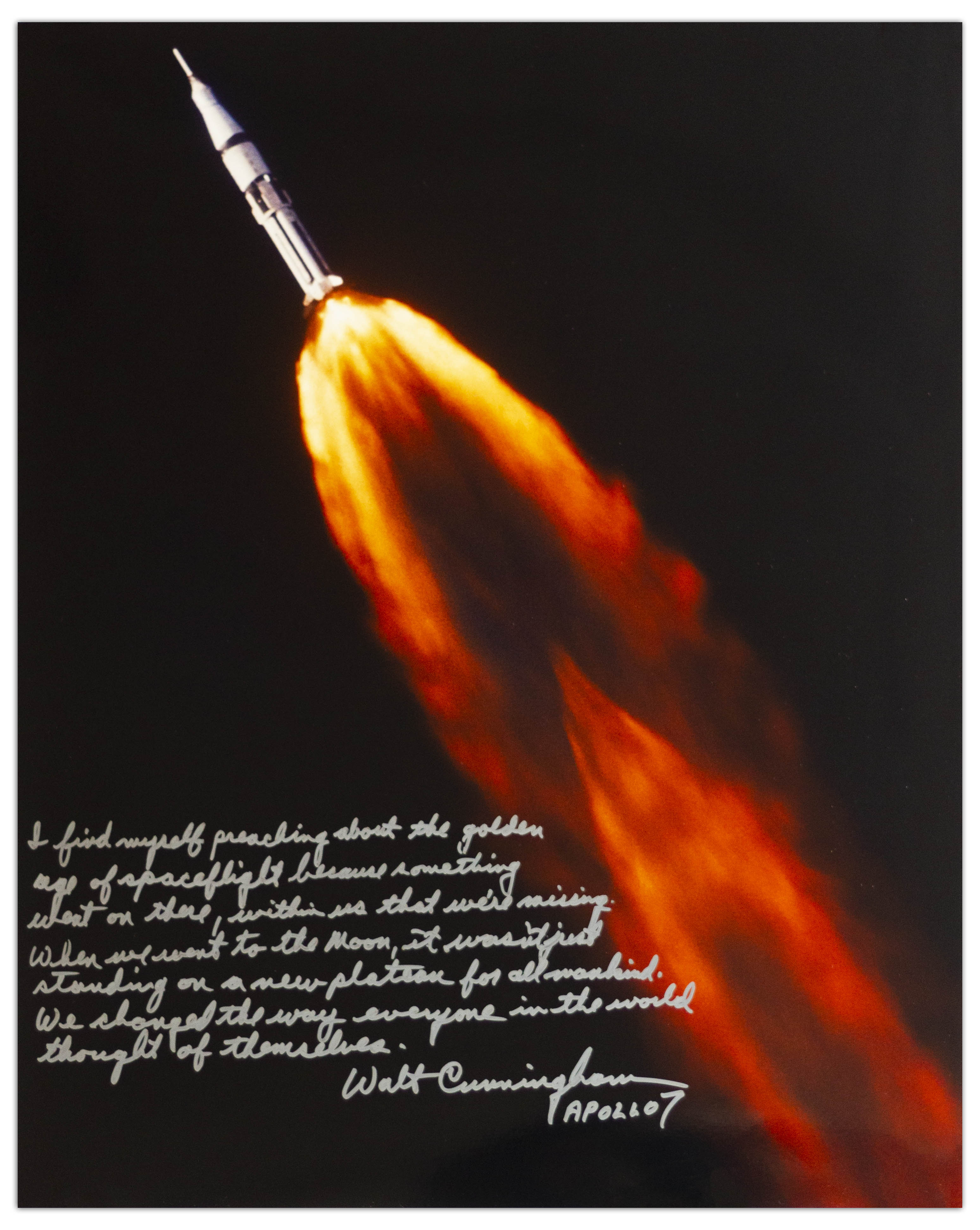 Walter Cunningham signed 16” x 20” dramatic photo of the Apollo 7 rocket launching into space on 11 October 1968. Cunningham writes a very personal message on the era of space travel, in full, ”I find myself preaching about the golden age of spaceflight, because something went on there, within us that we’re missing. When we went to the Moon, it wasn’t just standing on a new plateau for all mankind. We changed the way everyone in the world thought of themselves. / Walt Cunningham / APOLLO 7”. Near fine condition. Sold for $1,875.