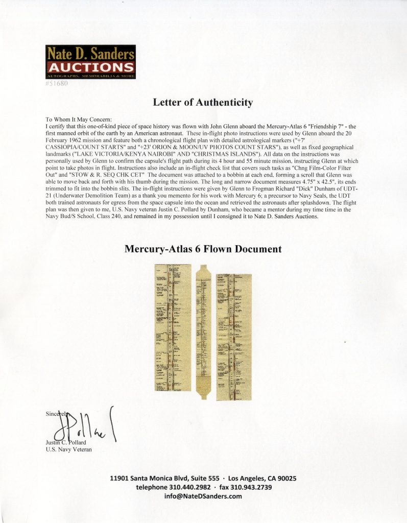 One-of-kind piece of space history flown with John Glenn aboard the Mercury-Atlas 6 “Friendship 7” – the first manned orbit of the earth by an American astronaut. These in-flight photo instructions were used by Glenn aboard the 20 February 1962 mission and feature both a chronological flight plan with detailed astrological markers (“+7′ CASSIOPIA/COUNT STARTS” and “+23′ ORION & MOON/UV PHOTOS COUNT STARS”), as well as fixed geographical landmarks (“LAKE VICTORIA/KENYA NAIROBI” AND “CHRISTMAS ISLANDS”). All data on the instructions was personally used by Glenn to confirm the capsule’s flight path during its 4 hour and 55 minute mission, instructing Glenn at which point to take photos in flight. Instructions also include an in-flight check list that covers such tasks as “Chng Film-Color Filter Out” and “STOW & R. SEQ CHK CET”. The document was attached to a bobbin at each end, forming a scroll that Glenn was able to move back and forth with his thumb during the mission. The long and narrow document measures 4.75″ x 42.5″, its ends trimmed to fit into the bobbin slits. The in-flight instructions were given by Glenn to Frogman Richard “Dick” Dunham of UDT-21 (Underwater Demolition Team) as a thank you memento for his work with Mercury 6; a precursor to Navy Seals, the UDT both trained astronauts for egress from the space capsule into the ocean and retrieved the astronauts after splashdown. The flight plan was then given to U.S. Navy veteran Justin C. Pollard by Dunham, who became a mentor during Pollard’s time in the Navy Bud/S School, Class 240. The document’s historical significance was confirmed by the John Glenn Archives at Ohio State University Libraries. Light creasing and wear, otherwise near fine. Additional provenance includes: (1) LOA from Justin Pollard; (2) 1959 photo of Dunham and Glenn together (Dunham is the blond gentleman, 4th from left in back row) and (3) screen-capture photo of the Mercury 6 cockpit, scroll visible in center of photo, in front of John Glenn. Sold for $66,993.