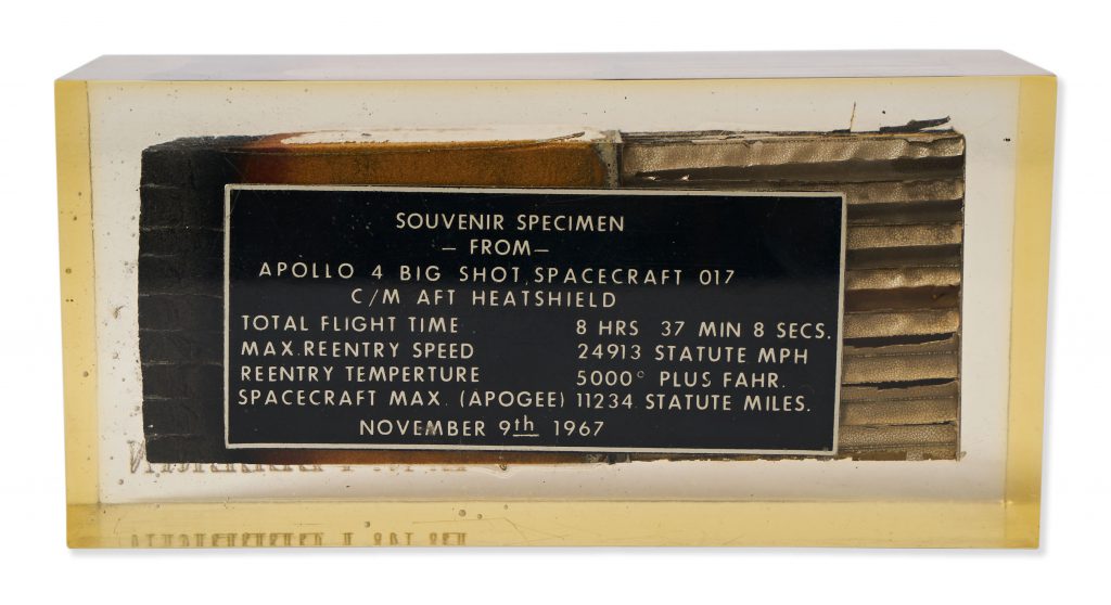 Apollo 4 flown heat shield segment, taken from the Command Module of the first Apollo mission, flown 9 November 1967. Segment is charred at bottom from reentry, housed in vintage acrylic with slip about the sample and mission, which was the first to test the Saturn V launch vehicle. Segment measures 4.75″ long x 1.875″ wide x 1.25″ tall, encased in lucite measuring 5.5″ x 2.75″ x 2″. The name of E.N. Pellerin appears on underside. A few minor surface scratches and minor yellowing to acrylic. Very good plus condition. Scarce. Sold for $1,800.