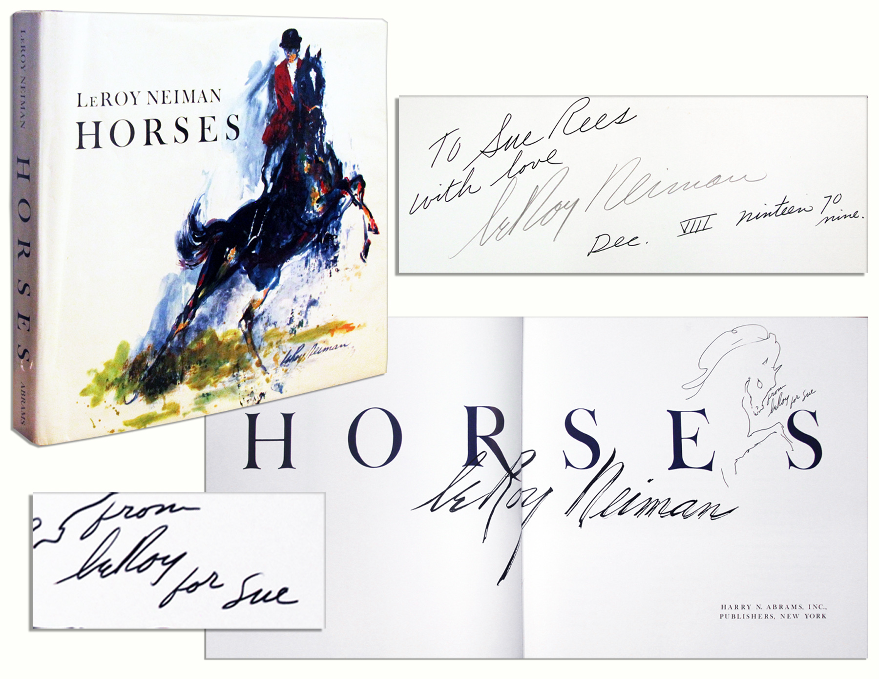 LeRoy Neiman signed horse sketch within his signed book ”Horses,” published by Henry M. Abrams: New York: 1979. The famed expressionist painter of high-profile sporting events, including the Kentucky Derby, sketches a horse in profile to the title page and signs it ”from LeRoy for Sue”. Upon the fly-leaf he signs his full name ”LeRoy Neiman” in pencil, along with an ink inscription, ”To Sue Rees with love / Dec. VIII nineteen 70 nine”. Inscription seems to have been penned at a different time from signature itself. Neiman’s ability to covey the look and feel of dynamic action in fast-paced athletic competitions resulted in his acclaim as the first sports artist of the world. The Smithsonian, the Whitney Museum, the Brooklyn Museum, and many others across the world count his art among their permanent collections. Hardcover volume runs 350pp. Measures 14.5” x 14.25”. With original dustjacket and pictorial endpapers. A blank bookplate is affixed to front free endpaper, along with a newspaper clipping on Neiman, else near fine. Minor creasing and edge wear to dustjacket, else near fine. Sold for $1,220.