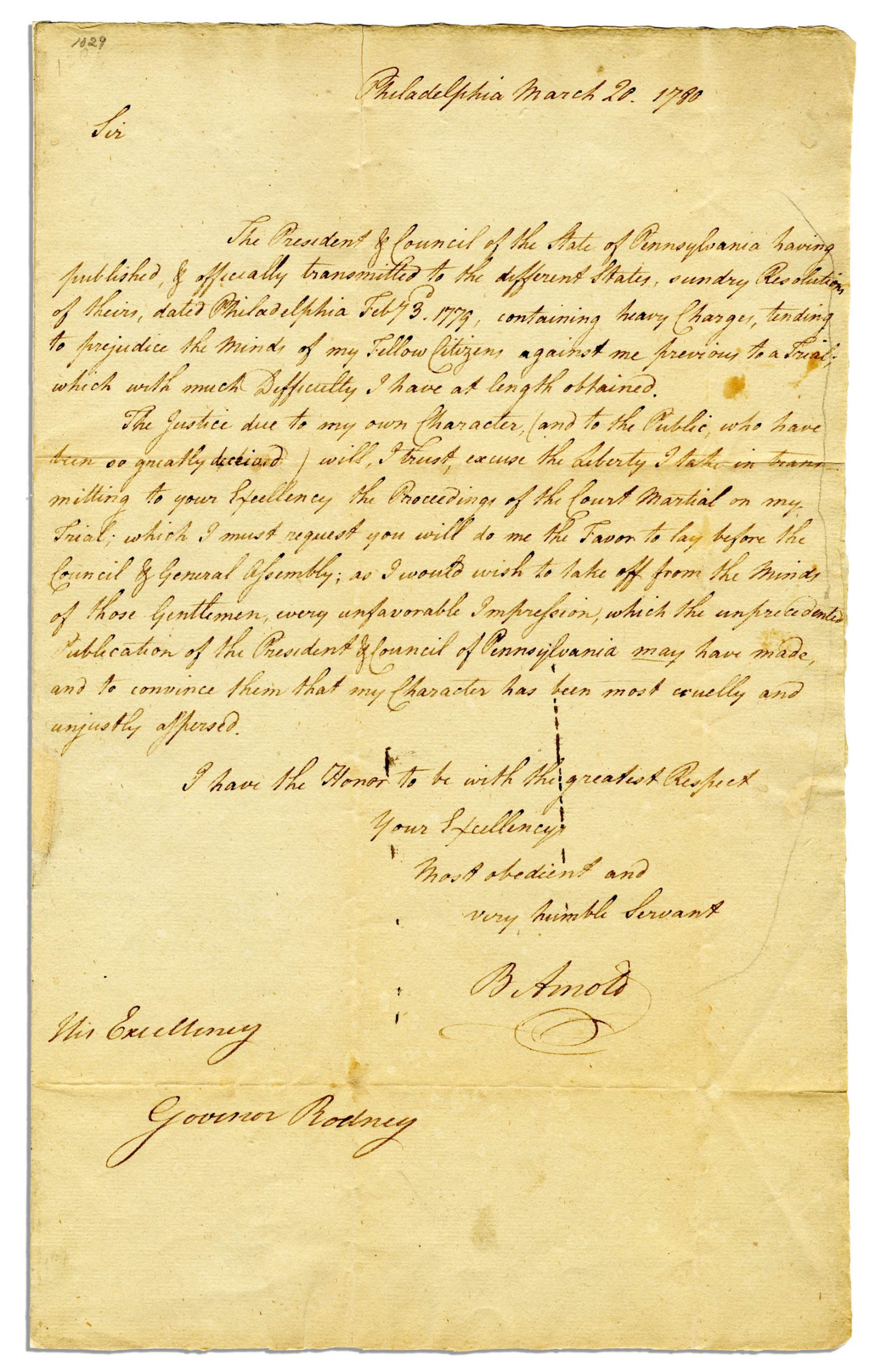 Fantastic and scarce Benedict Arnold autograph letter signed “B Arnold” from Philadelphia, 20 March 1780, the year his betrayal to America was exposed. The notorious turncoat here tries to clear his name by requesting that the “good men of Delaware” have his court martial acquittal read aloud in the Delaware legislature (he writes to Delaware Governor and Declaration signer Caesar Rodney). Even though a court martial had cleared General Arnold of most charges, he was, whilst writing this letter, actively giving secrets to the British; his treason wouldn’t be fully discovered until six months later when Major Andre was captured with plans of West Point provided by Arnold. Letter reads in full: “Sir / The President of Council of the State of Philadelphia having published, & officially transmitted to the different States, sundry Resolutions of theirs, dated Philadelphia February 3, 1779, containing heavy Charges, tending to prejudice the minds of my Fellow Citizens against me previous to a trial, which with much difficulty I have at length obtained. The Justice due to my own Character (and to the Public who have been so greatly deceived) will, I trust, excuse the Liberty I take in transmitting to your Excellency the Proceedings of the Court Martial on my Trial, which I must request you will do me the Favor to lay before the Council of General Assembly, as I would wish to take off from the Minds of those Gentlemen every unfavorable Impression, which the unprecedented publication of the President of Council of Pennsylvania may have made, and to convince them that my Character has been most cruelly and unjustly aspersed. I have the Honor to be with the greatest Respect / Your Excellency / Most Obedient and / very humble Servant / B Arnold”. Arnold had been publicly accused of war profiteering and abuse of his powers as an American general the previous year. He demanded a court-martial to clear his name. The trial was not held for almost a year; in the meantime he began actively negotiating and sharing secrets with the British. The precise wording of Arnold’s statement is quite clever and even honest in a sense. Arnold was keenly aware of his own guilt, so he doesn’t actually claim that he has been slandered. He only wishes to convince the good men of Delaware that he has been slandered. Arnold would be publicly rebuked by George Washington just three weeks later, but the discovery of his treachery and his defection would not come for six more months. Provenance: Birch’s Lawrence Washington sale, 21 April 1891, lot 384; Parke-Bernet’s Oliver R. Barrett sale, 30 October 1950, lot 59. Single page letter is toned and with repaired seal holes. Dark Benedict Arnold autograph. Measures 8″ x 13.25″. Near fine. Sold for $28,100.