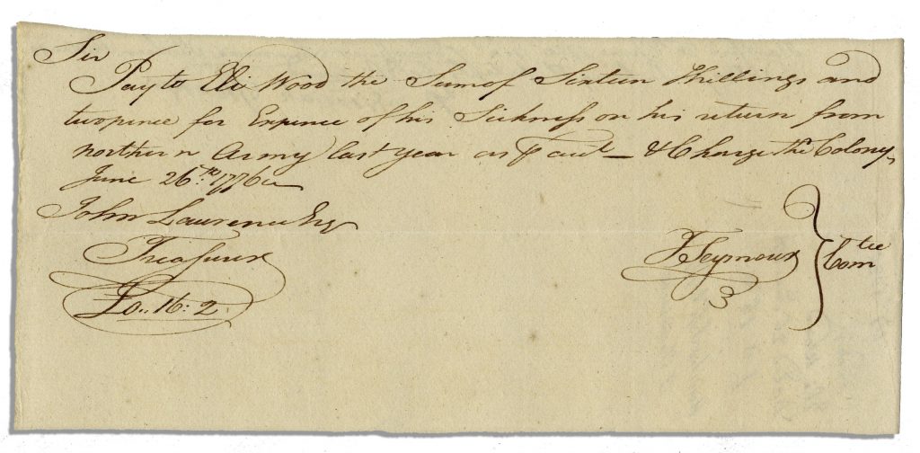 Document addressed to one of Benedict Armold’s soldiers. Dated 1776, document mandates pay for a man who served in the Northern Army, the branch of the Continental Army that served under Arnold’s leadership and captured Montreal the year before. Handwritten document reads in part, ”Sir, Pay to Eli Wood the Sum of Sixteen Shillings and two pence for Expence of his sickness on his return from northern army last year…charge the Colony / June 26 1776 / [signed] J Seymour”. 1pp. document measures 8.25” x 4”. Notations to verso and slightly irregular top and bottom edges. Near fine, given age. Sold for $156.
