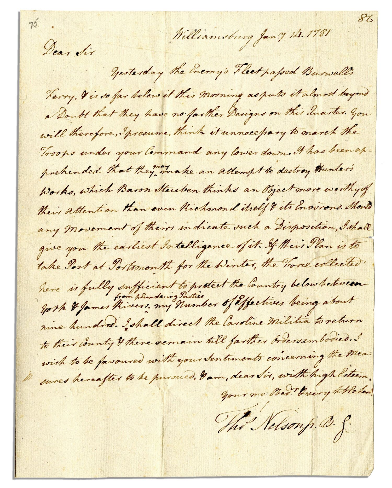 Declaration of Independence signer Thomas Nelson letter signed, ”Thos Nelson Jr” as Brigadier General. From Williamsburg, Virginia, he writes to Brigadier General George Weedon concerning the whereabouts of Benedict Arnold and his men. Dated 14 January 1781, it reads: ”…Yesterday the enemy’s fleet passed Burwell’s Ferry, & is so far below it this morning as puts it almost beyond a doubt that they have no farther designs on this quarter…[but might] post at Portsmouth… [The militia at Nelson’s command is] fully sufficient to protect the county below between York & James Rivers from plundering parties…” Single page measures approximately 6.5” x 8.5”. Small tear near center and a small seal hole. Light toning and soiling. In very good to near fine condition. Sold for $10,541.