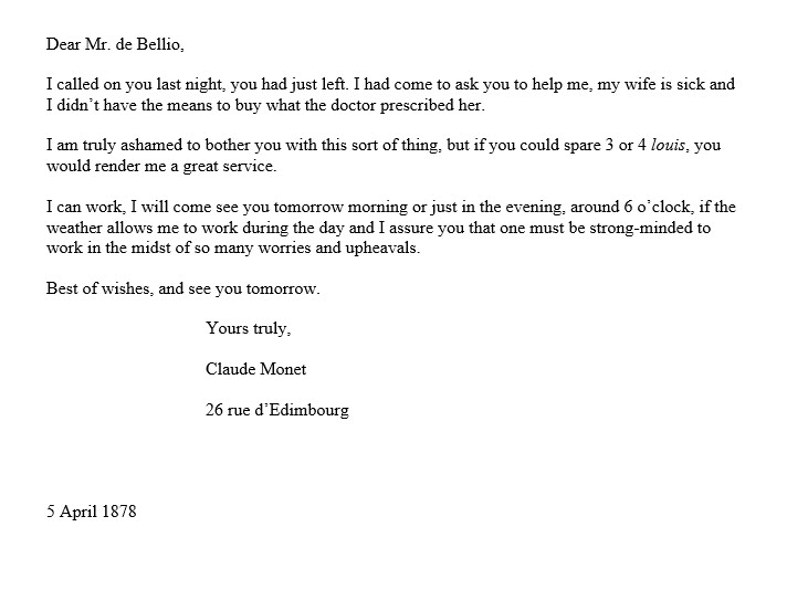 With all my thanks for thinking of me, please believe in my sincere sympathies / Claude Monet”.