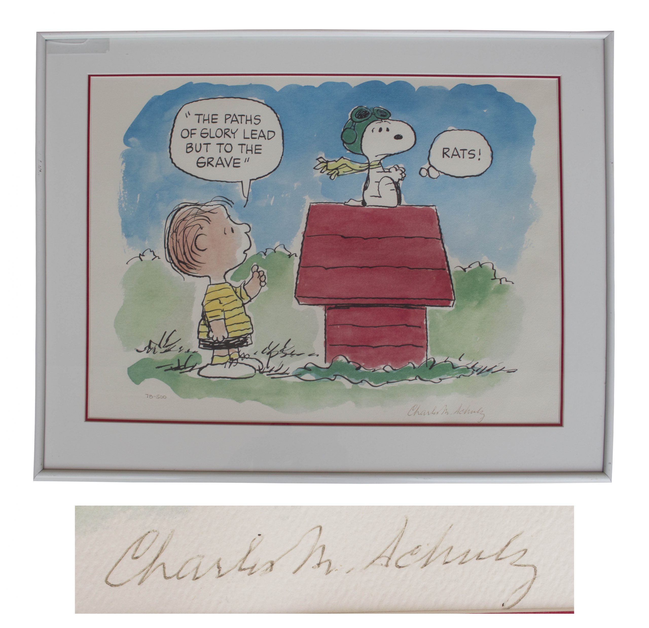 Charles Schulz signed, limited edition ”Peanuts” lithograph, from the Flying Ace series. In this colorful lithograph on Italian watercolor paper, Linus repeats a line from the famous Thomas Gray poem, to Snoopy’s dismay as the WWI Flying Ace. Lithograph is #78 of 500. Measures approximately 18” x 13.5”, framed to 22.25” x 18”. Small crack to glass of frame, otherwise near fine. Sold for $500.