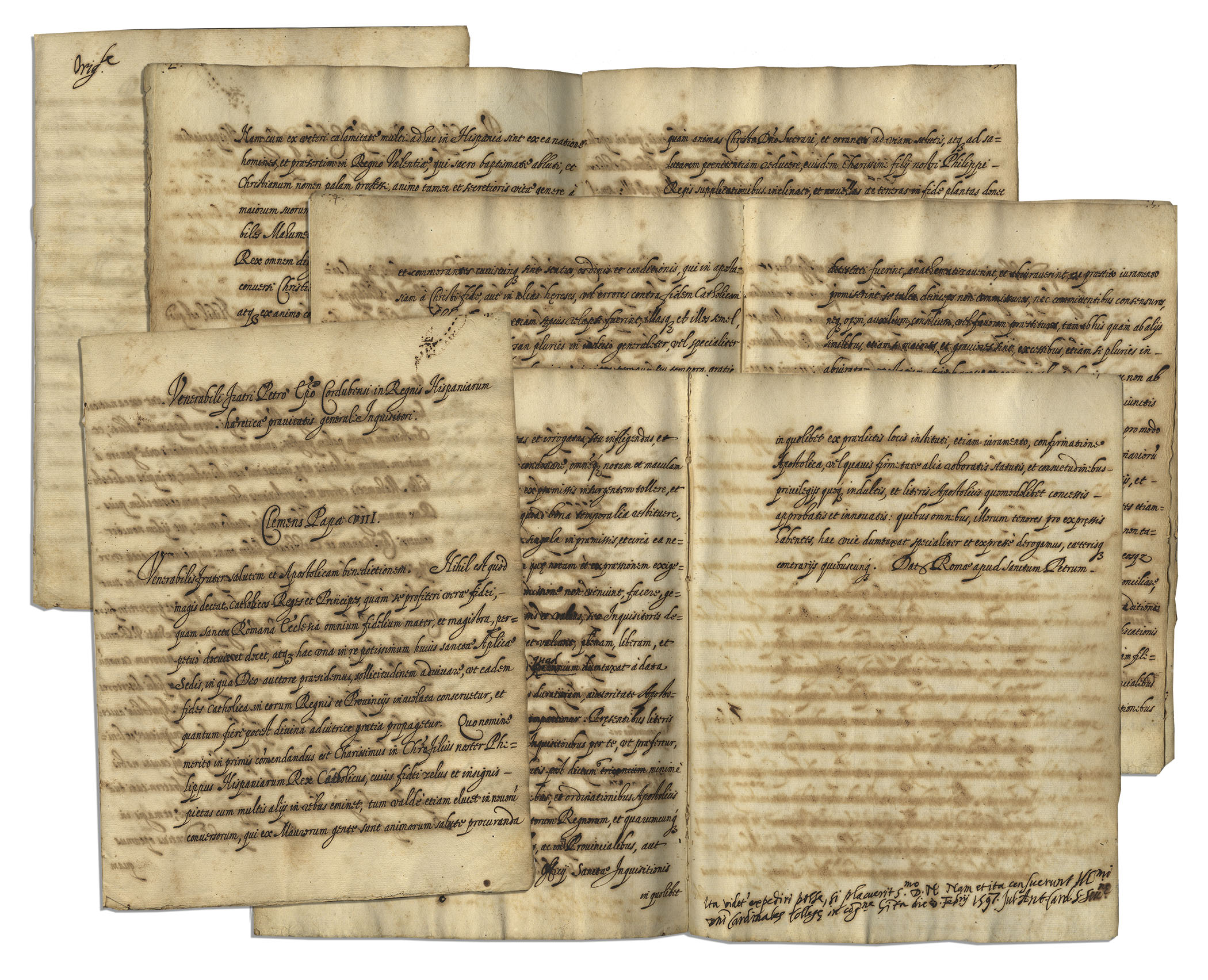 Period manuscript copy of Pope Clement VIII’s letter to the General Inquisitor of Spain, with forceful content regarding the Inquisition. Dated 1597, document in Latin translates in part, ”Pope Clemens VIII to the General Inquisitor of Spain, Peter the Bishop of Corduba…Since there is nothing more suitable to kings and princes than professing the true faith, King Phillip of Spain, recently converted some moors, yet many of them, especially in Valencia, even though having been baptized, still secretly profess and practice their former religion, and follow the errors of Mohamed. Following his former predecessors in going against apostasy and heresy, Clemens VIII asks the bishop, in order to better strengthen the faith of the newly converted, to enforce greater punishments upon them, and to cut off the lethal cult at its roots, by even appointing more inquisitors, and converting the moors, their children, and nephews, by oath and confirmation…” Runs 7pp. on 5 sheets, with one sheet blank save for a small notation to upper left. Measures 8.5 x 10.5”. Toning and bleeding to ink, else near fine. Sold for $1,875.