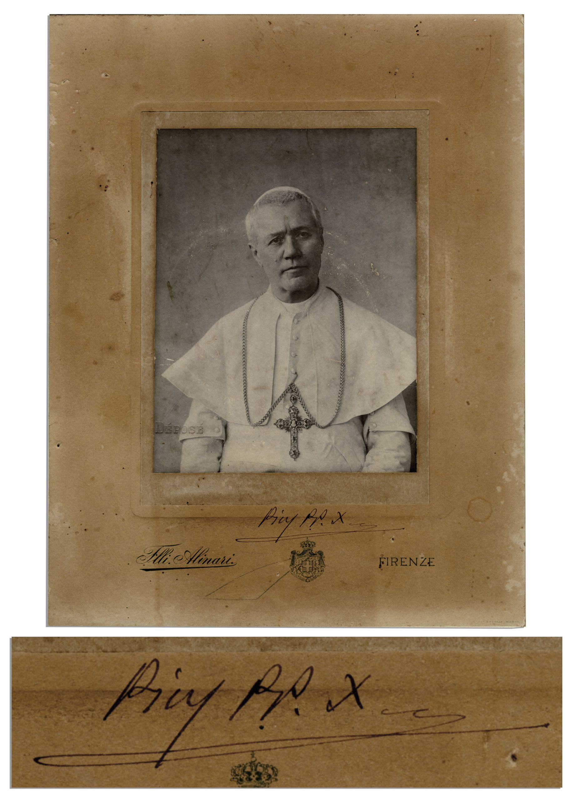 Pope autograph of Saint Pius X on his photo, ”Pius P.P. X”. Photo portrait of the Catholic leader in papal regalia is mounted to signed mat. Mat credits the image to Filli Alinari, Firenze. Portrait is embossed, ”Depose”. Measures 4.25” x 5.5” on 7.75” x 9.75” mat. Toning, fading and pencil notations to verso. Very good. Sold for $1,563.