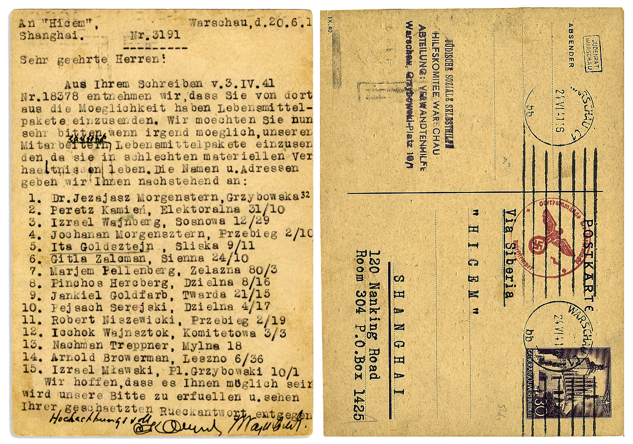 Postcard from a Jewish charity in Nazi-occupied Poland requesting aid for 15 families. Postmarked Warsaw, 24 June 1941, card is also stamped with Konigsberg Nazi postal censor and Jewish Council Warsaw marks. Postcard’s pictorial side is printed with an urgent request in German for relief and provisions for fifteen local Warsaw families. Help is sought from the Warsaw-expat Jewish community in Shanghai by way of HICEM, an emigration organization that assisted 90,000 Jews in escaping Europe during the Holocaust. Requisition translates to: ”Dear Sirs, From your writing 3.IV.41 Nr. 18378 we gather that you have the ability to send packages with food and provisions. We would like to ask you now kindly to send whenever possible food packages to our employees, as they are living in very materially poor circumstances. We have listed the names and addresses below…We hope that you’ll be able to accommodate our plea and are looking forward to your answer as expected by law. [Handwritten signature of a representative]”. Postcard is addressed in type to ”’HICEM’ / 120 Nanking Road, P.O. Box 1425, Shanghai, China”. Opposite, sender’s address is rubber stamped in purple as, ”Judische Soziale Selbstghilfe, Helfskomitee Warschau, Abteilung: Verwandtenhilfe, Warschau, Grzybowski-Platz 10/1”, translating to: ”Jewish Social Self-Help / Help Committee of Warsaw / Department of Help For Relatives”. Body of letter also lists 15 individuals for whom help is needed. Text has a few corrections in ink by an unknown hand. Postcard measures approximately 5” x 3”. Toning, else near fine. Sold for $787.