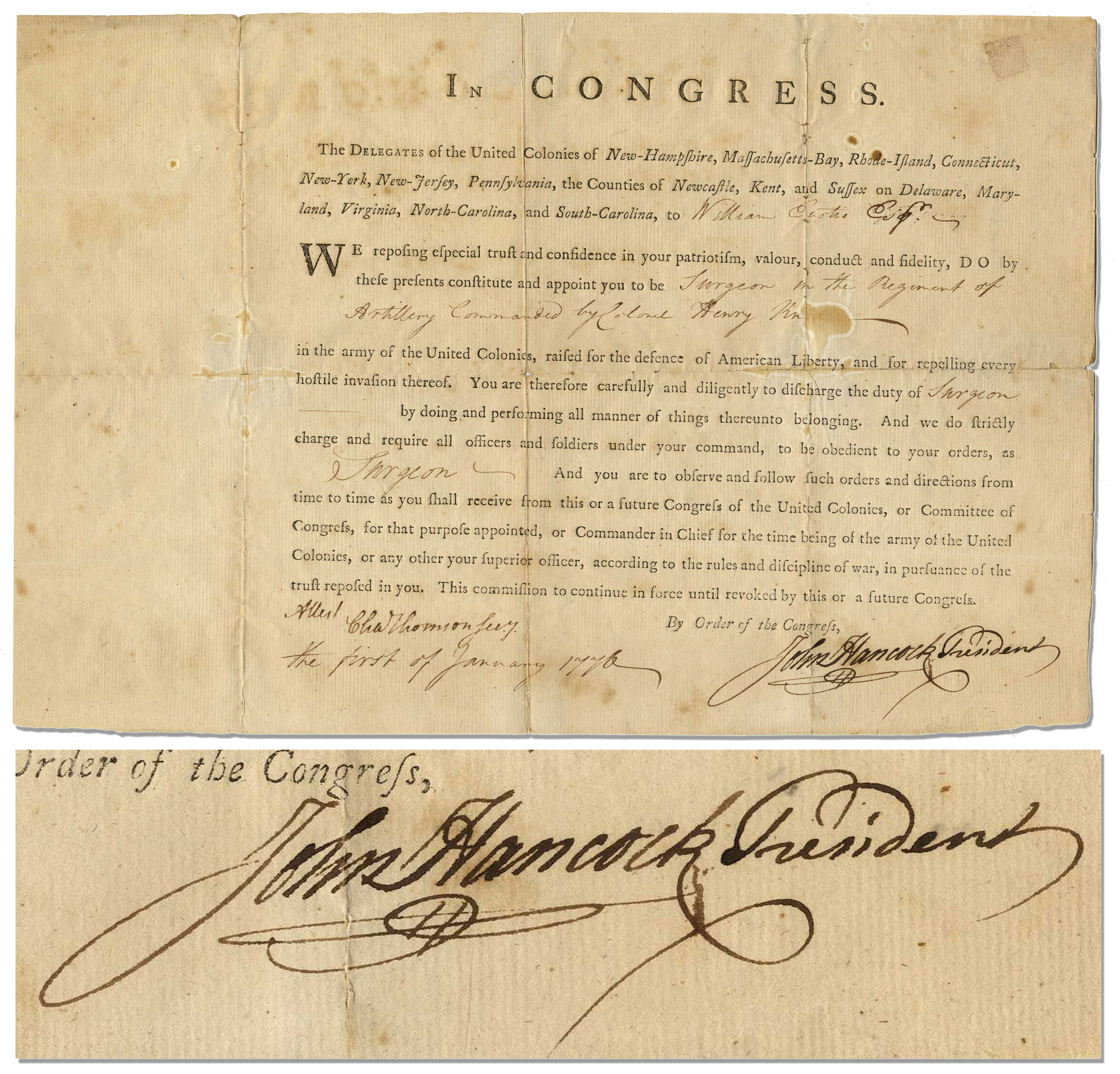 John Hancock document signed, appointing William Eustis as “Surgeon”, dated 1 January 1776, with Hancock’s distinctive signature and paraph in bold black ink. Eustis would later serve as Secretary of War, Congressman and Massachusetts Governor. Appointment reads in part: “…The Delegates of the United Colonies of New-Hampshire, Massachusetts-Bay, Rhode-Island, Connecticut, New-York, New Jersey, Pennsylvania, the Counties of Newcastle, Kent, and Sussex on Delaware, Maryland, Virginia, North-Carolina, and South-Carolina, to William Eustis…We reposing special trust and confidence in your patriotism, valour, conduct and fidelity, DO by these present constitutes and appoint you to be Surgeon in the Regiment of Artillery Command by Colonel Henry Knox in the army of the United Colonies, raised for the defence of American Liberty, and for repelling every hostile invasion therof…” Signed “John Hancock / President”. Document measures 14.25″ x 9.5″, with light dampstaining and five small holes along folds. Very good condition. Sold for $9,500.