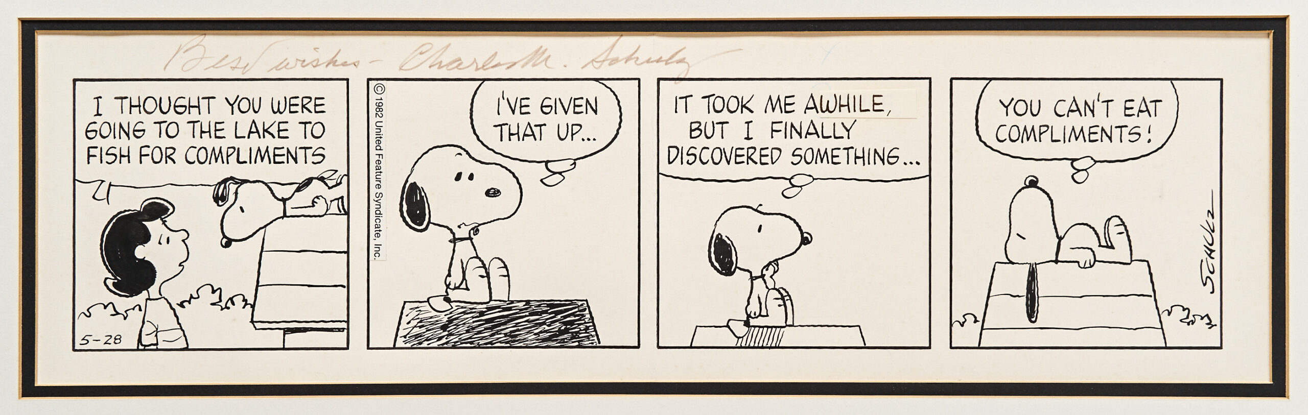 We sold a Peanuts daily comic strip published on 28 May 1982 for $25,000. In this charming strip, Snoopy comes to the realization that fishing for compliments won’t help curb his hunger. Strip is also signed by Charles Schulz on top margin, “Best Wishes – Charles M. Schulz”.