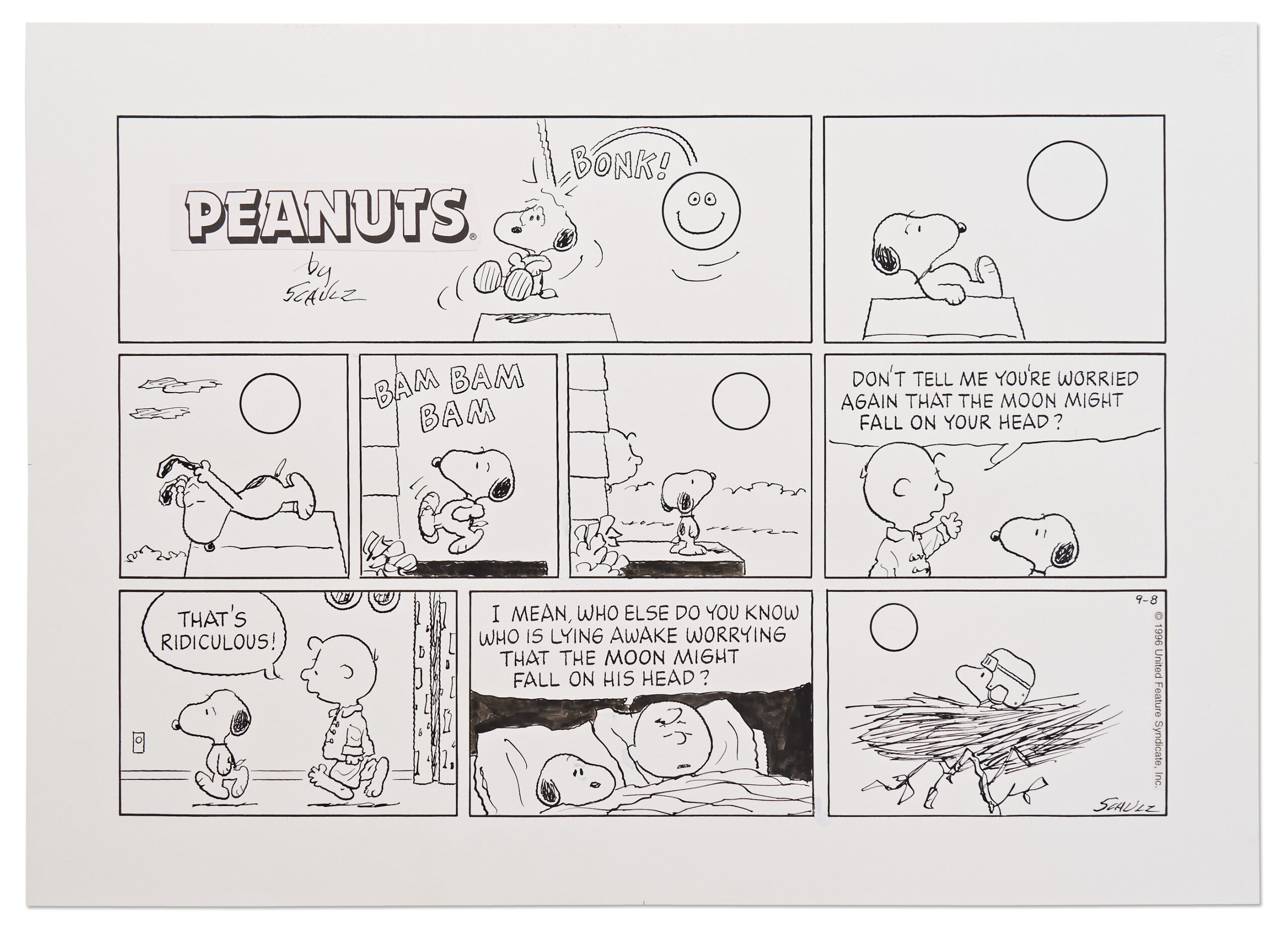 We realized $31,250 for a Charles Schulz Sunday Peanuts strip published on 8 September 1996. In the strip Snoopy worries that the moon fill fall on his head. The last panel depicts Woodstock outside in his nest clad in head protection for such a catastrophe. Adorable strip reflects on very human fears and emotions.