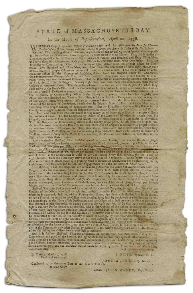 Superb Revolutionary War broadside from April 1778, a scarce “Call to Arms” for the men of Massachusetts to help build the “Great Chain” on the Hudson River that extended from West Point to Constitution Island, constructed in the spring of 1778. The Great Chain was a feat of inspired engineering, comprised of iron links each weighing 114 pounds that extended 600 yards across the bend in the Hudson River at West Point. As control of the River was tantamount to controlling the waterways from New York City to Montreal, several Battles had been waged on the Hudson before the Colonists conceived of the idea to construct chains across specific points in the River, so that the Army could bombard British ships when they were stalled as a result of the chains. The most effective of these chains was the Great Chain, which took advantage of a narrow “S” shaped curve on the River at West Point. Although Benedict Arnold famously told the British that “a well-loaded ship could break the chain”, the Great Chain held and prevented British boats from crossing. The Hudson River would remain in the hands of the Colonists. Sold for $2,500.