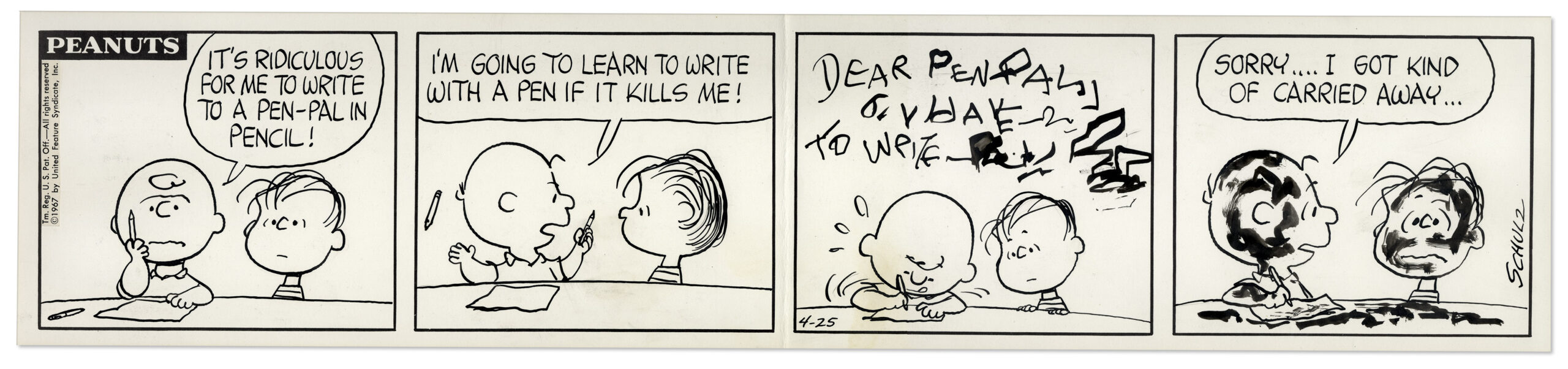 One of Charlie Brown’s most endearing traits is that he’s incredibly resilient. If he fails at something, he always picks himself and tries again. We realized $18,750 for a daily comic strip featuring Charlie Brown attempting to use a pen with Linus. Charlie Brown struggles to keep all the ink on the paper and the strip concludes with a funny mess for he and Linus.