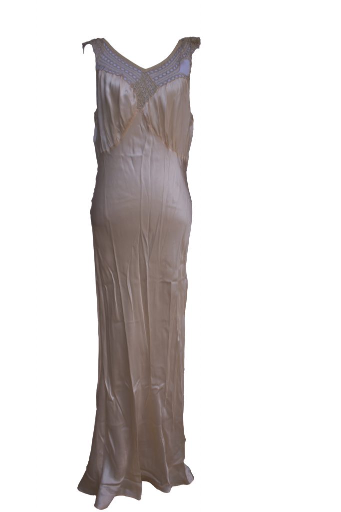 Farrah Fawcett personally owned negligee from her role as Barbara Hutton in “Poor Little Rich Girl”, the 1987 movie for which she was nominated for an Emmy. The movie won an Emmy for Outstanding Costume Design. Blush-colored silk negligee is 1940s inspired (possibly vintage), with ruching and lace detailing around the shoulders and bust. Measures 57″ long, approximately 30″ across the bust and 26″ across the waist. In very good condition with a few small tears and spotting. From the personal collection of Farrah Fawcett. Sold for $1,000.