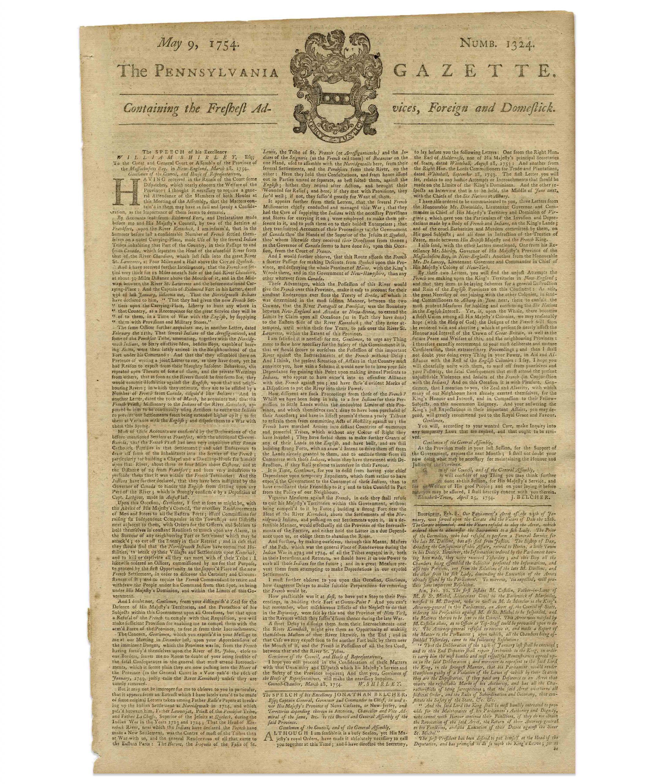 The most influential political cartoon in the history of America, the ”JOIN, or DIE” severed rattlesnake designed by Benjamin Franklin and published in his ”Pennsylvania Gazette” on 9 May 1754. This incredibly scarce newspaper is the very first printing of the ”JOIN, or DIE” cartoon, and the only known copy apart from one other housed in the permanent collection at the Library of Congress.