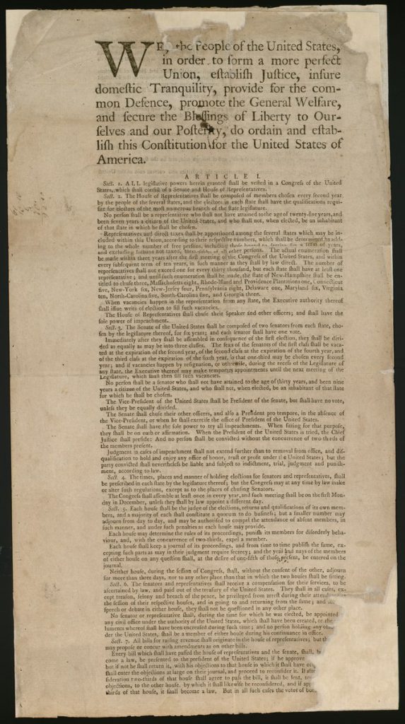 Important newspaper reporting on the conclusion of the Constitutional Convention, the body that drafted, deliberated and finally signed the U.S. Constitution on 17 September 1787. Based in Philadelphia, where the Convention deliberated from 25 May to 17 September, “The Pennsylvania Packet, and Daily Advertiser” reports on 18 September 1787 the following: “We have the heart-felt pleasure to inform our fellow citizens that the Federal Convention adjourned yesterday, having completed the object of their deliberations-And we hear that Major W. Jackson, the secretary of that honorable body, leaves this city for New York, this morning, in order to lay the great result of their proceedings before the United States in Congress.” Sold for $2,500.