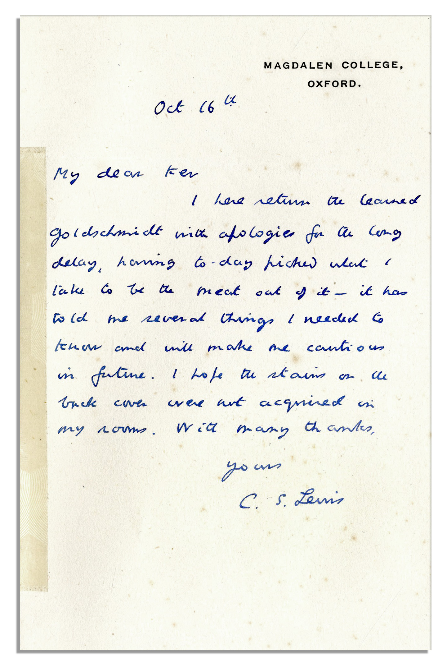 C.S. Lewis autograph letter signed. Dated 16 October upon Magdalen College, Oxford stationery, the “Chronicles of Narnia” author writes, “My dear Ken / I here return the learned Goldschmidt [book] with apologies for a long delay, having today picked which I take to be the meat out of it – it has told me several things I needed to know and will make me cautious in future. I hope the stains on the back cover were not acquired in my room. With many thanks, Yours / C. S. Lewis”. Mild foxing and creasing to the single-page letter measuring 4.5″ x 7″. Letter comes affixed to the interior hinge of the “Goldschmidt” book in question with tape along its left edge. In very good condition. The softcover publication is titled “Medieval Texts and Their First Appearance in Print” published by the Bibliographical Society at the University Press, Oxford: London: 1943. Runs 144pp. and measures 7″ x 9″. Covers are nearly detached, else very good. A rare, humorous, and intriguing letter by one of the most renowned literary figures of the 20th century. Sold for $3,279.