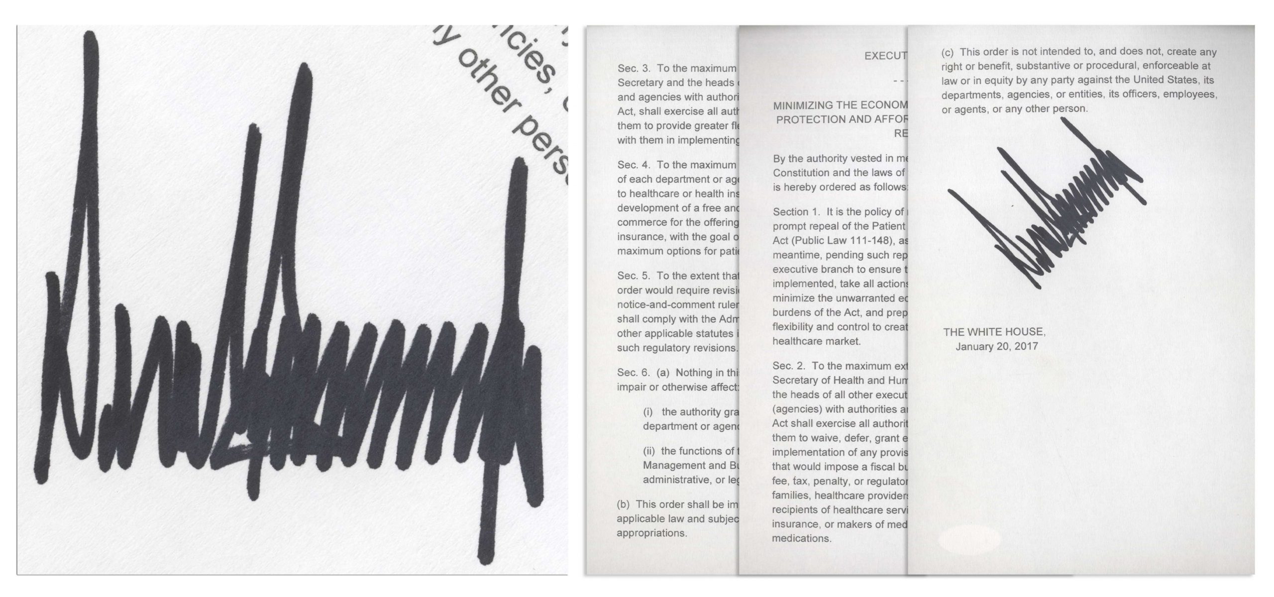Donald Trump signed souvenir executive order regarding the enforcement of ”Obamacare”, the Patient Protection and Affordable Care Act. Executive order 13765 was signed by President Trump just hours after assuming office on 20 January 2017, as one of his campaign promises. In anticipation of the repeal of the Affordable care Act, Trump here removes some of the mandates that fell on states in complying with the original law. Three page document on three sheets is boldly signed by Trump in black felt-tip on the last sheet. Each sheet measures 5.625” x 9”. Near fine condition. With JSA COA. Sold for $6,913.