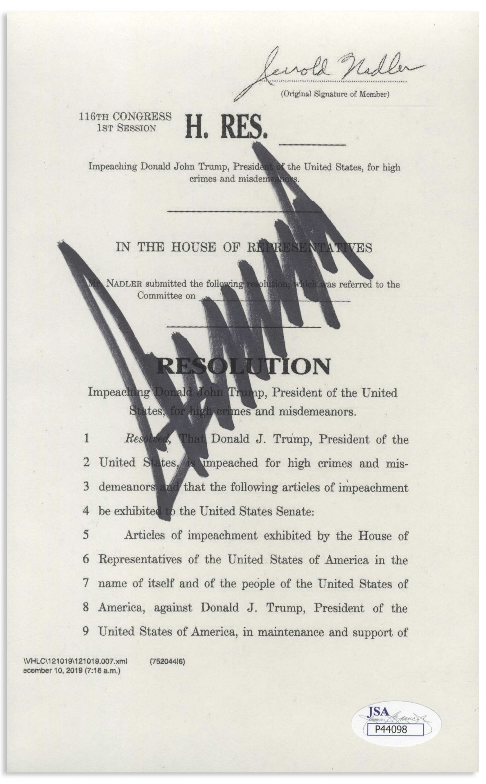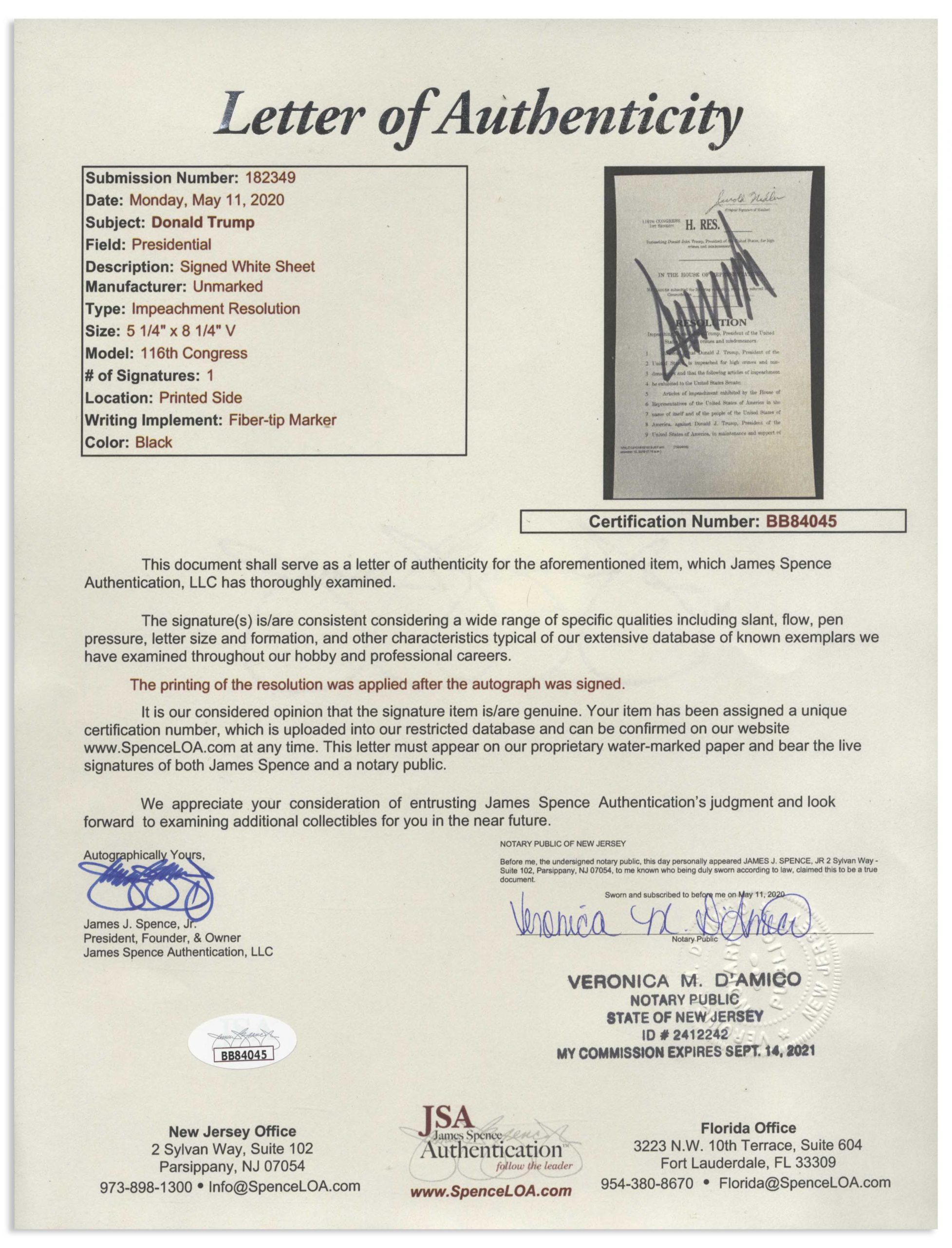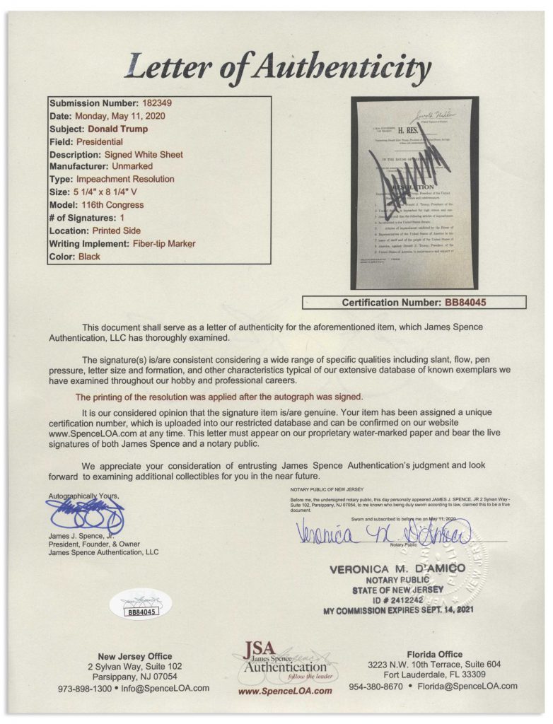 Articles of impeachment signed by the target of impeachment, President Donald J. Trump. Souvenir document is boldly signed by Trump as President in black felt-tip, with his large signature filling almost the entire page of House Resolution 755, ”Impeaching Donald John Trump, President of the United States, for high crimes and misdemeanors.” Page measures 5.25” x 8.375”. Near fine condition. With JSA COA. Sold for $3,300.