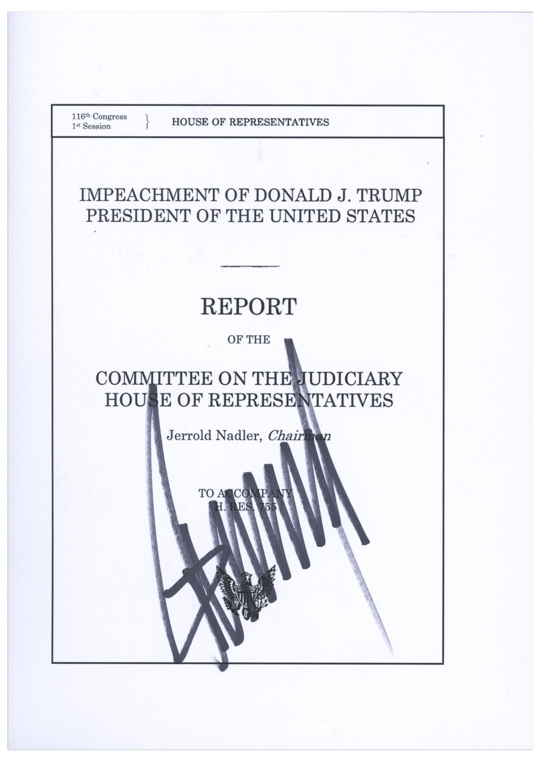 Articles of impeachment signed by the target of impeachment, President Donald J. Trump. Souvenir document is boldly signed by Trump in black felt-tip, with his large signature on House Resolution 755, ”Impeaching Donald John Trump, President of the United States, for high crimes and misdemeanors.” Near fine condition. With Beckett COA. Sold for $6,250.