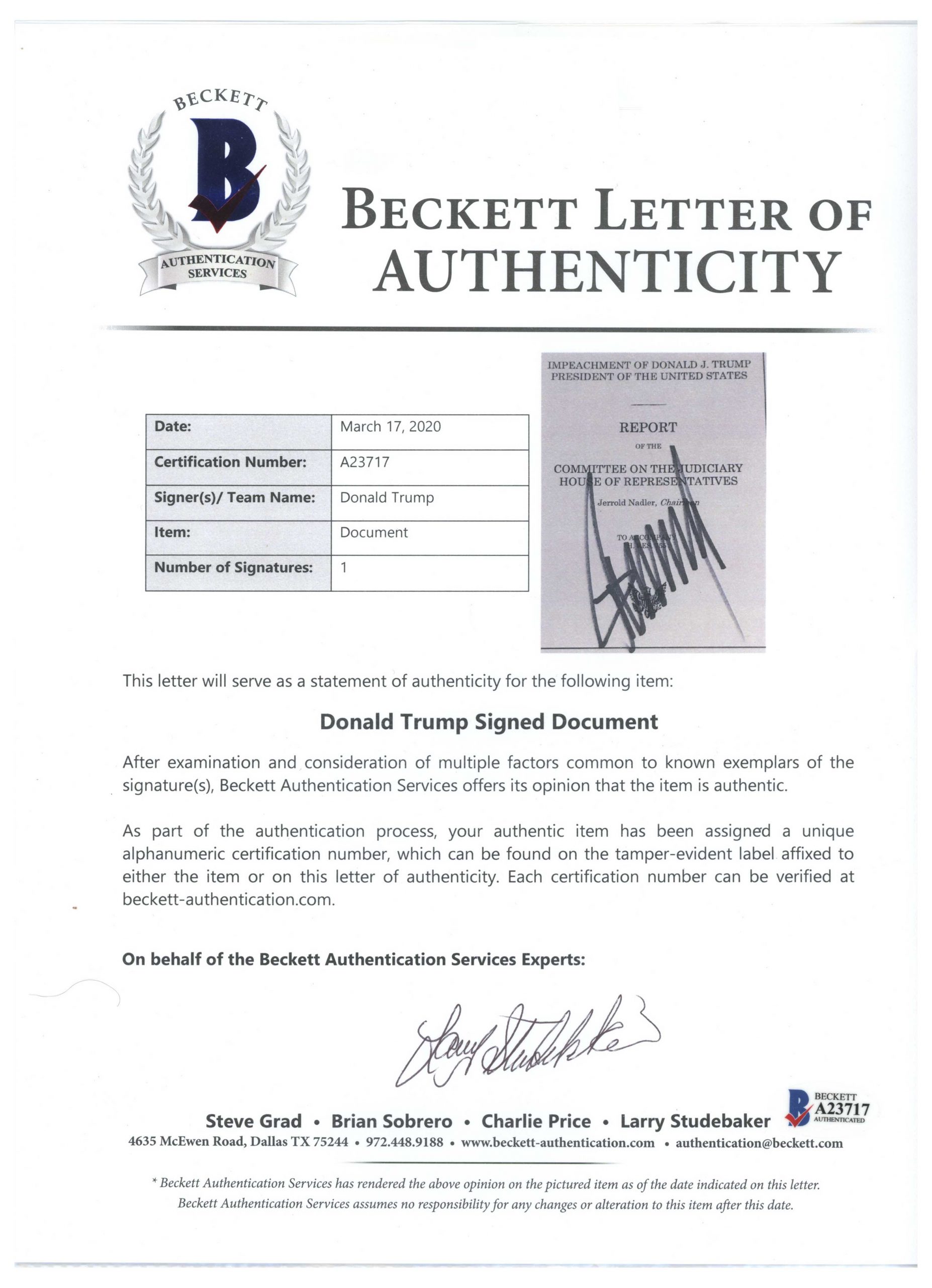 Donald Trump Souvenir Impeachment Report Signed as President — With Beckett COA