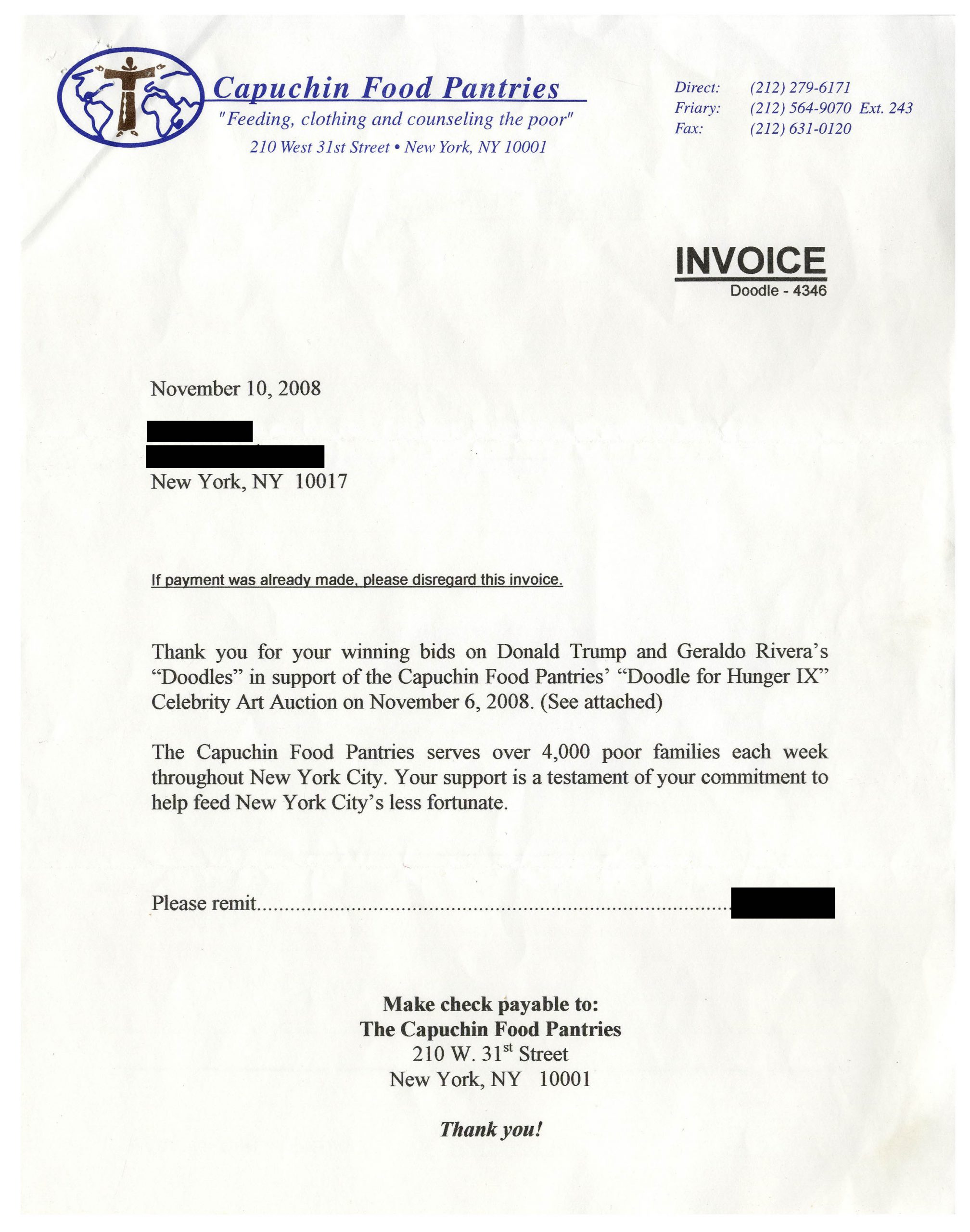 Donald Trump hand-drawn and signed sketch of the New York City skyline, along with a signed photo of the President. Composed and signed ”Donald J Trump” in gold marker, artwork measures 8” x 5”, matted and framed to a size of 15” x 18”. Included in the framed artwork is a 3.25” x 5” photo of Trump, signed in the same gold marker by the President ”Donald J Trump”, who also writes ”THING BIG!” Near fine condition. Originally drawn by Trump for a charity event in 2009, benefiting the East Texas Literacy Council, and with the original receipt and paperwork from the event. Sold for $6,875.
