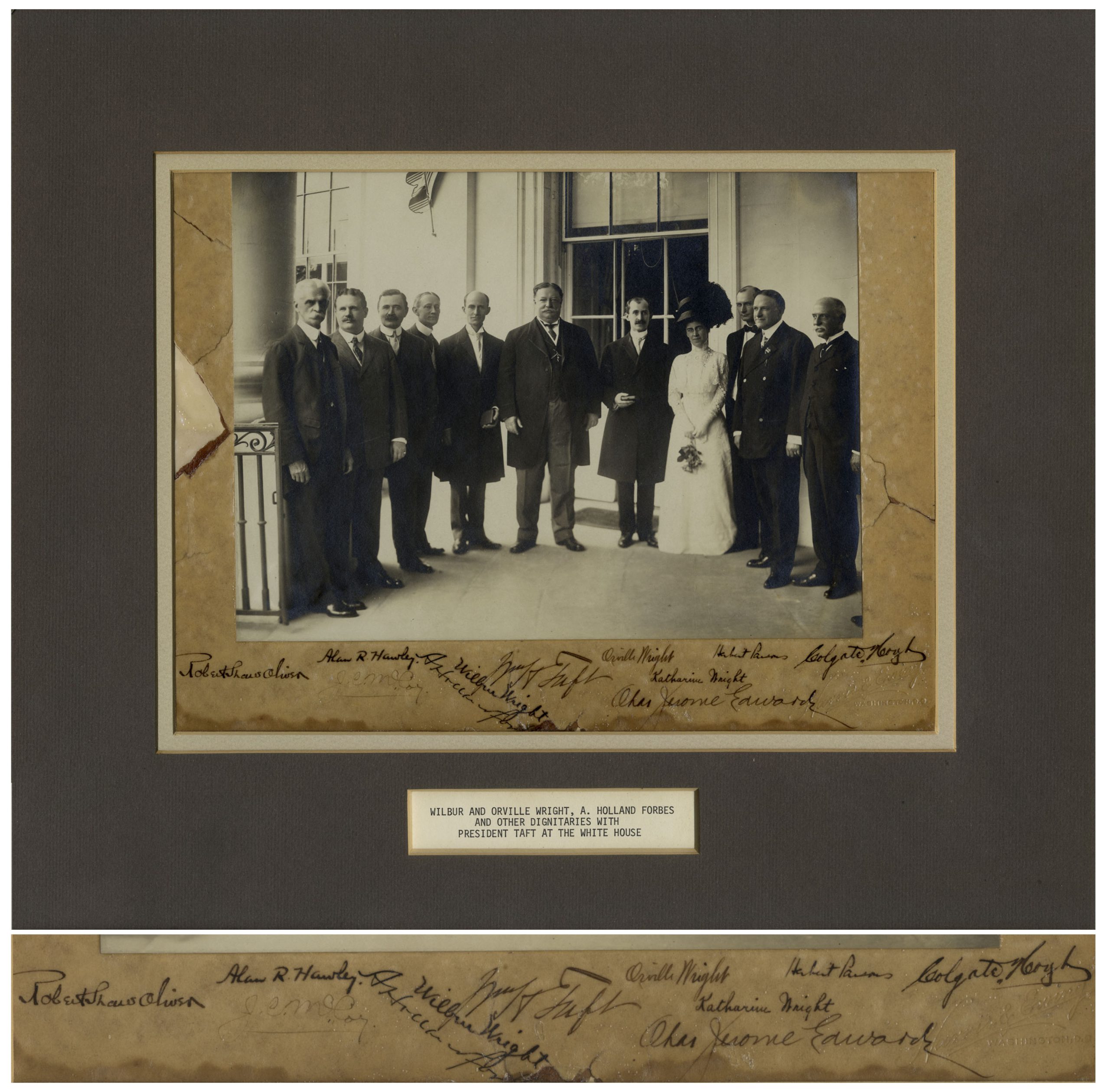 Signed photo by Wilbur Wright, Orville Wright, President Taft and a handful of others during the Wrights’ visit to the White House on 10 June 1909 to receive medals from the Aero Club of America. At this time, the Wright Brothers and their sister Katharine were among the most sought after celebrities in the world, having just completed very successful exhibition flights in Europe and the United States, as required by the U.S. Army with whom they signed a contract to build a ”flying machine”. Until this time, skeptics were reluctant to believe that the Wright Brothers were able to successfully pilot an airplane, but the Wrights’ fluency in the air caused doubters to not only reverse their criticism, but issue public apologies and lavish praise upon the aviators. At the end of 1908, their influence was so widespread that they even changed women’s fashion, with the hobble skirt (narrowed at the ankles so as not to flare up during flight) becoming mainstream shortly after the flights. Silver gelatin 9.25” x 7” matte photograph is by Harris & Ewing, mounted to a visible size of 11.75” x 8.5” upon which the individuals sign their names: ”Wilbur Wright”, ”Orville Wright”, ”Wm H Taft”, ”Katharine Wright”, aviator ”A. Holland Forbes”, aviator ”Alan R. Hawley”, automotive pioneer ”Chas Jerome Edwards”, Assistant Secretary of War ”Robert Shaw Oliver” and three others. Matted to a size of 16.25” x 14.25”. Some paper loss to left side of mat, closed tear to right side, and crack starting along bottom. Light sheen has been applied to mount, likely from previous restoration to repair cracks. Some dampstainig to lower edge. Overall in good condition with very bold and clear signatures. Sold for $15,000.
