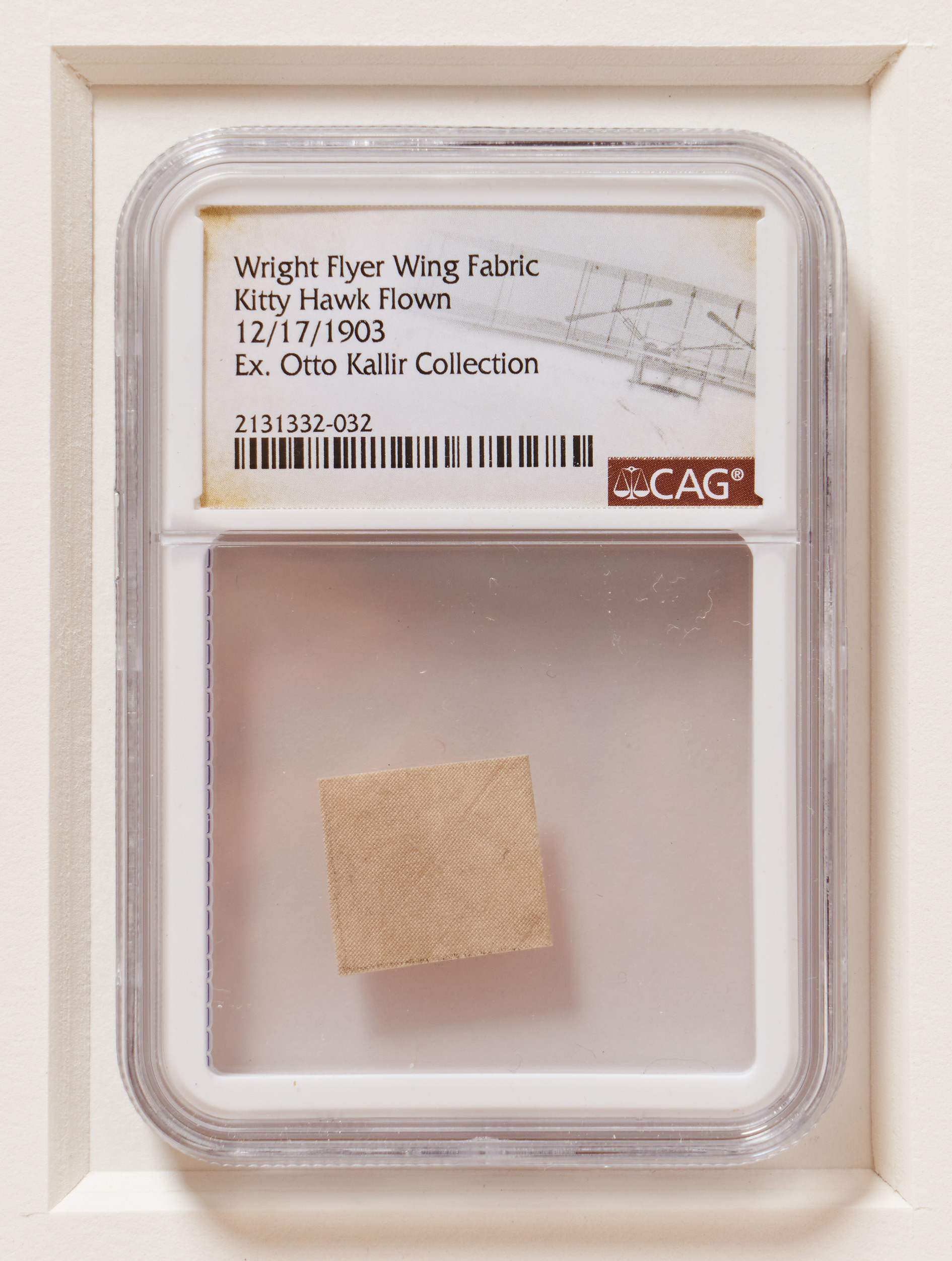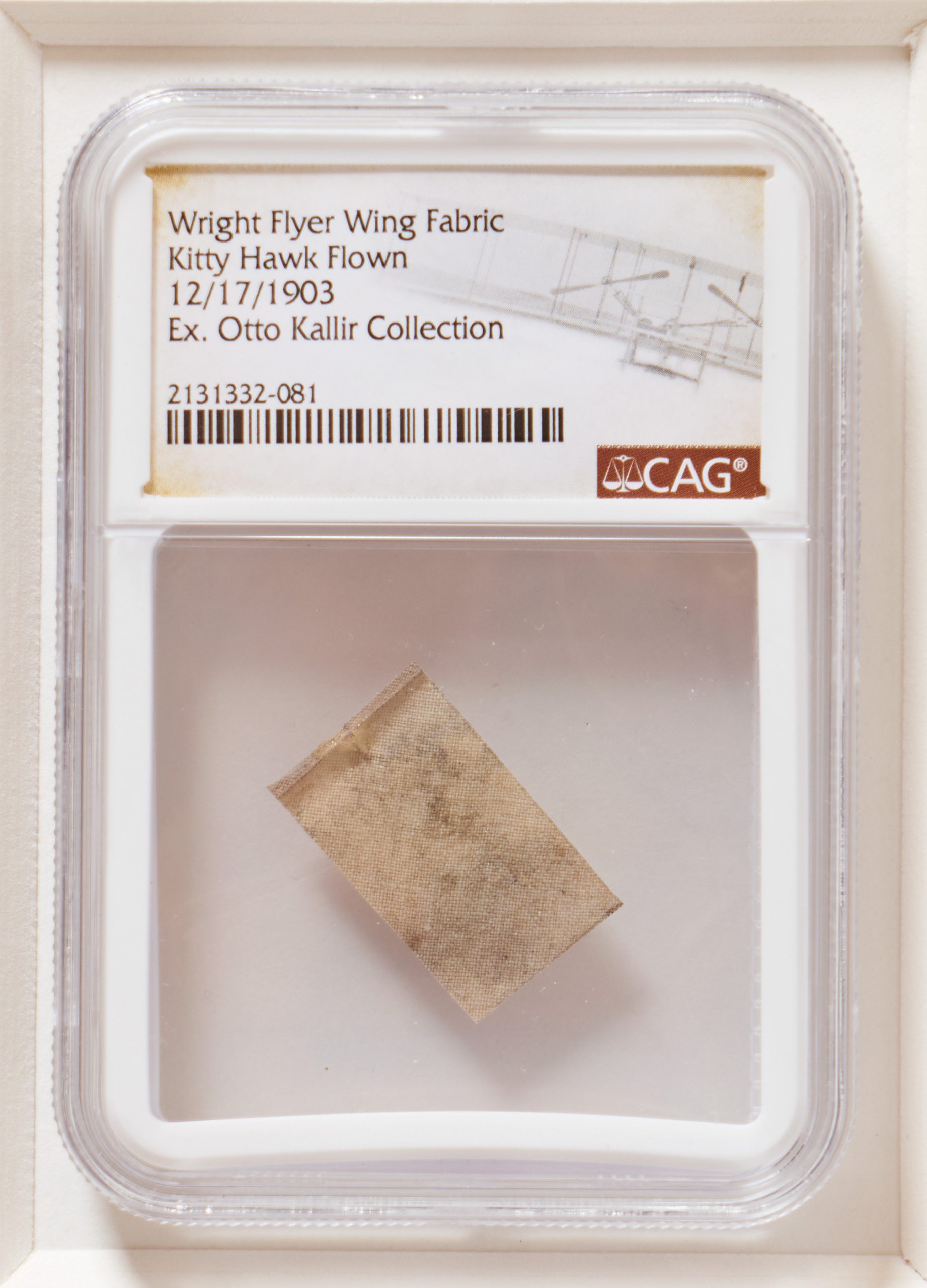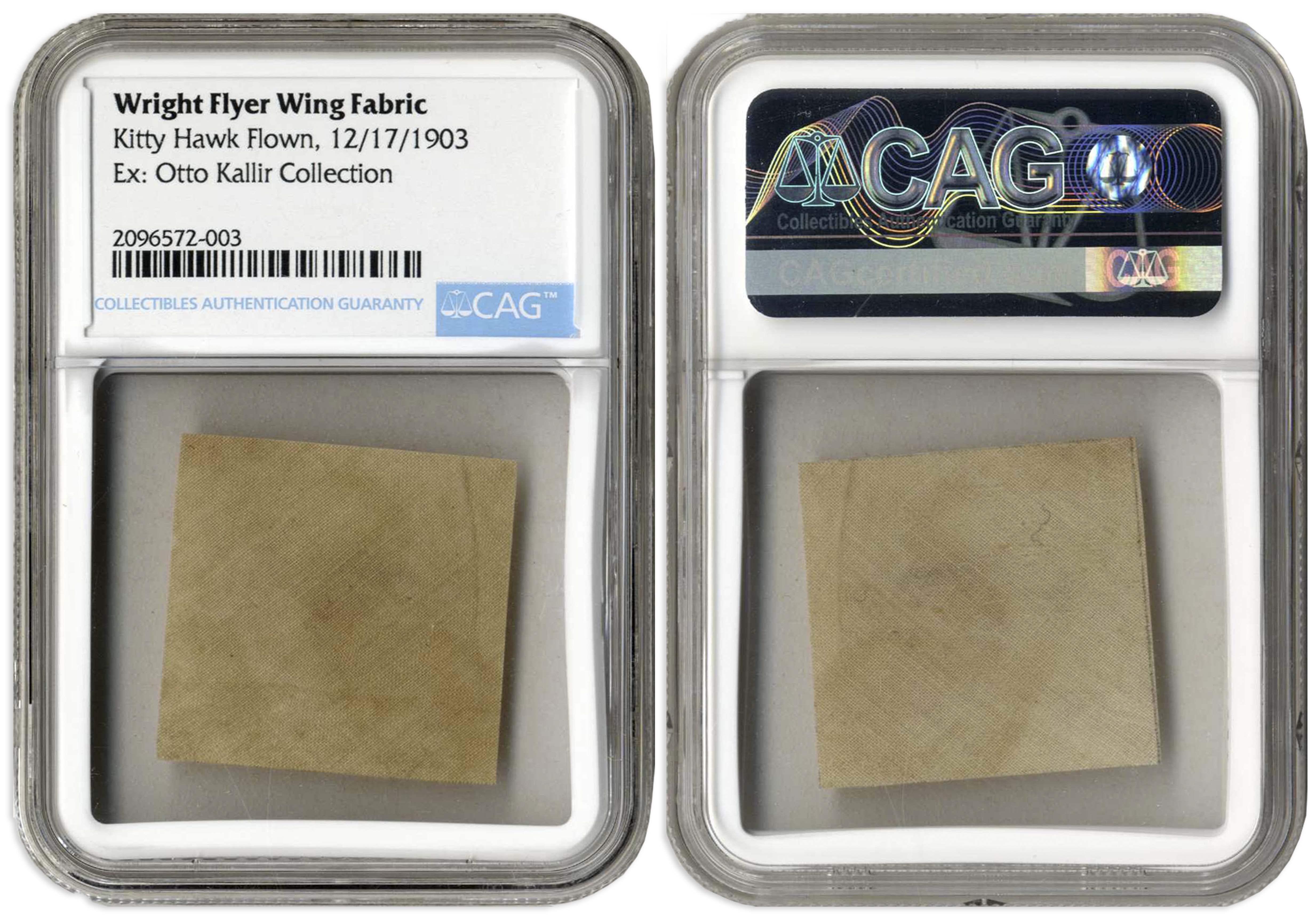 Fabric from the Wright Flyer, the first airplane which made its debut flight at Kitty Hawk on 17 December 1903, famously giving wings to mankind. Fabric measures 1.25” square, encapsulated by CAG, who certifies that the fabric was taken from the wings of the Wright Flyer flown at Kitty Hawk. When the Flyer was prepared for public exhibition, Orville Wright discovered that the fabric on parts of the plane could not be used, and substituted new fabric. The original fabric was then bequeathed to Lester Gardner, Editor of Aviation and Aeronautical Engineering, and close friend of Orville Wright, who gave the fabric to individuals in the aeronautical community, including Otto Kallir, from whom this fabric originates. Casement by CAG measures 2.375″ x 3.375″. A rare memento from the first flight, famously launching the century of aviation and space travel. Sold for $10,000.