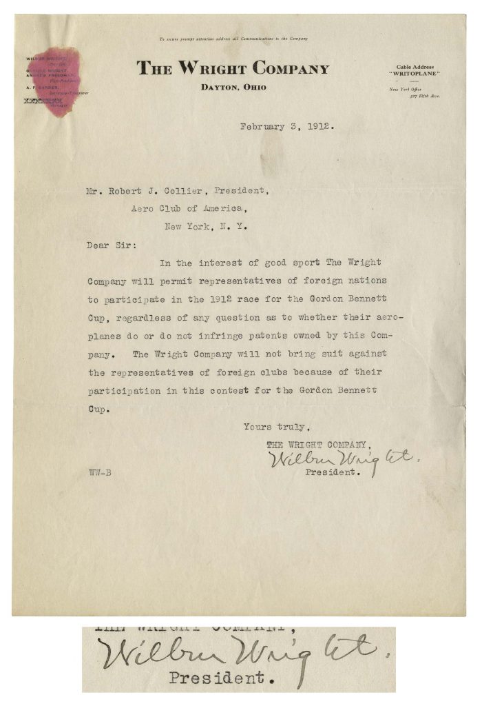 Wilbur Wright Letter Signed From 1912 in Which He, “In the Interest of Good Sport” Allows Patent Infringing “Aeroplanes” to Participate in World Famous Race