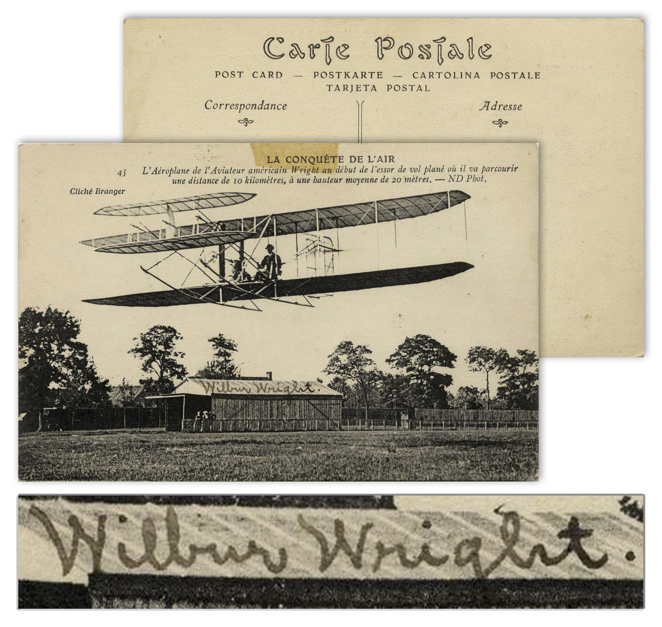 Wilbur Wright signed French postcard captioned “La Conquete de L’air” (“Conquest of the Air”), cleverly signed “Wilbur Wright.” on the roof of the barn underneath the plane. At the time of this photo in December 1908, the Wright brothers were conducting exhibition flights throughout Europe that made them worldwide celebrities. Collotype photographic postcard shows Wilbur Wright piloting the plane in Le Mans, France. Measures 5.5″ x 3.5″. Small bit of tape at top edge, otherwise near fine condition. Sold for $13,650.