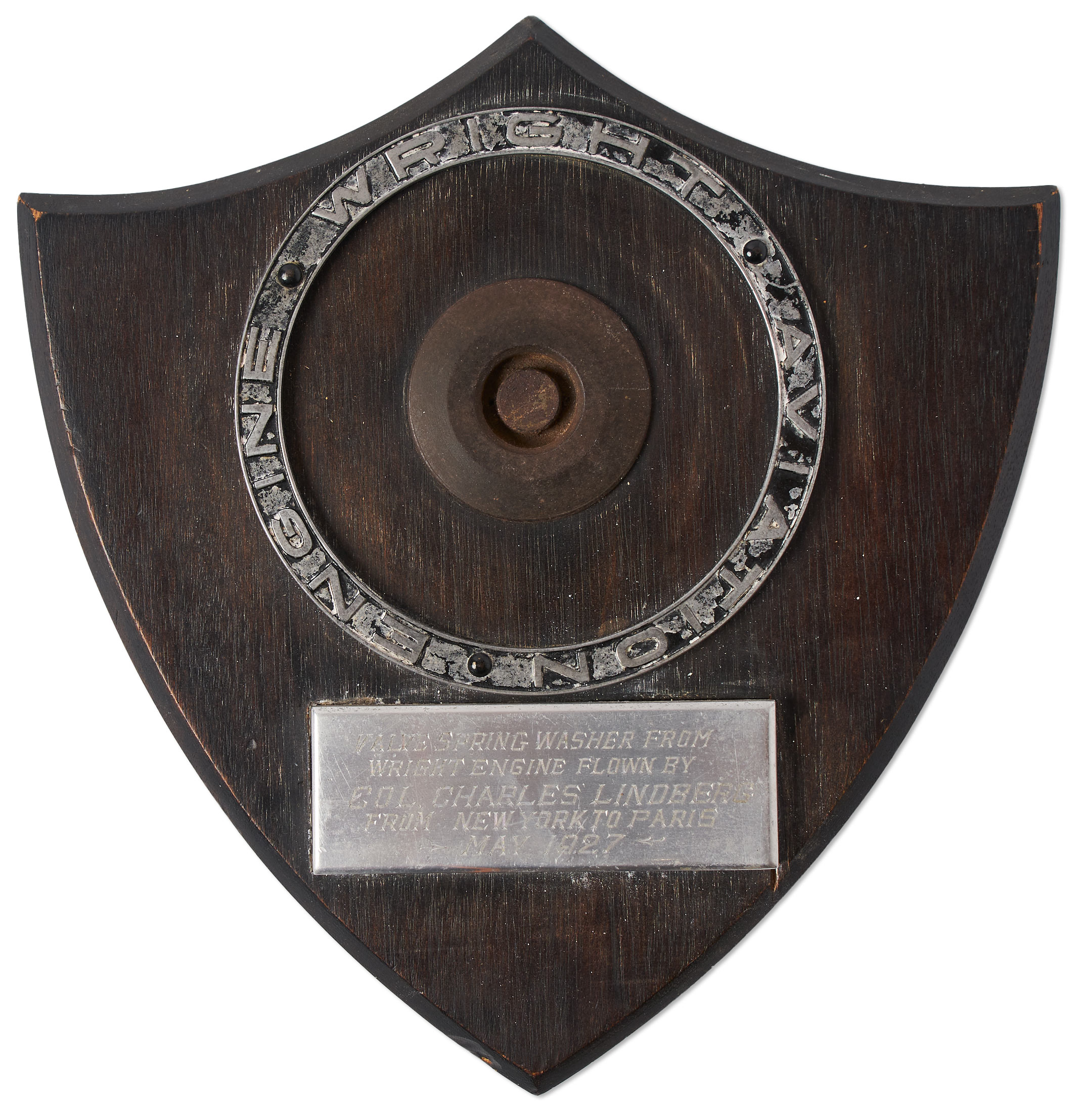 Plane piece from ”The Spirit of St. Louis”, piloted by Charles Lindbergh in the historic first solo non-stop transatlantic flight in 1927 from New York to Paris. Piece is a Valve Spring Washer, taken from the Wright J-5 Whirlwind Radial Engine in the plane, here presented by Wright Aviation Engine Company, a short-lived aeronautics venture which owned the ”Bellanca” plane that flew from New York to Germany two weeks after Lindbergh’s flight. The ”Bellanca” was actually Lindbergh’s first choice of plane, but the Wright company wouldn’t allow him to fly it without a navigator, so Lindbergh settled on the ”Spirit”. Washer is displayed in a wood plaque measuring approximately 9” x 9.25”, with metal plaque reading in part, ”Valve Spring Washer from Wright Engine Flown by Col. Charles Lindberg [sic] From New York to Paris / May 1927”. Rusting to washer, and some wear to presentation, overall in good condition. Scarce. Sold for $15,000.