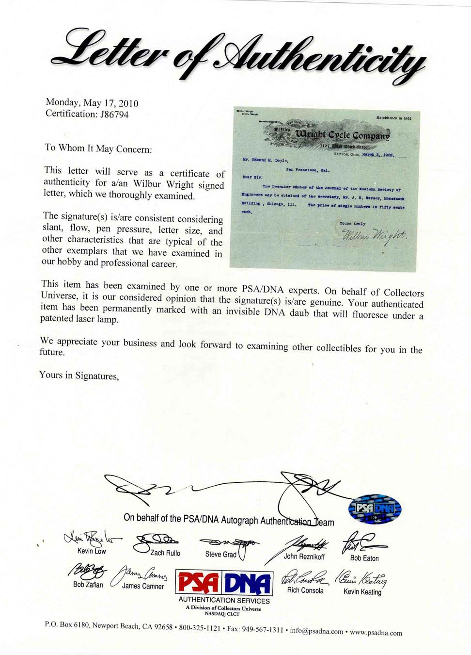 Typed letter signed, one page, 8.5″ x 11″, Wright Cycle Company letterhead, March 3, 1902. Letter to Edmund Doyle in San Francisco. In full: “The December number of the Journal of the Western Society of Engineers may be obtained of the secretary, Mr. J. H. Warder, Monadnock Building, Chicago, Ill. The price of single numbers is fifty cents each.” In very good condition, with intersecting folds, a vertical and horizontal fold through signature, small and very light stain over beginning letters of signature, small tear to top edge, light mirroring of type to bottom portion of page, and several small holes to page, none affecting signature or text. Accompanied by the original mailing envelope, missing part of the front panel. Pre-dating their historic first flight by more than a year, this letter references a lengthy piece that appeared in the aforementioned publication. In that piece, entitled “Some Aeronautical Experiments,” Wright discussed some of “the difficulties which obstruct the pathway to success in flying-machine construction,” giving detailed engineering insight into the topic that he admits to being “very simple in theory.” In that article, he goes through great pains to discuss an unmanned flight in 1900 at Kitty Hawk, a test run that would lead to a date with history. It’s no small wonder then that someone like Mr. Doyle, and presumably countless others, would want to read more about his experiments. With PSA/DNA COA. Sold for $10,745.