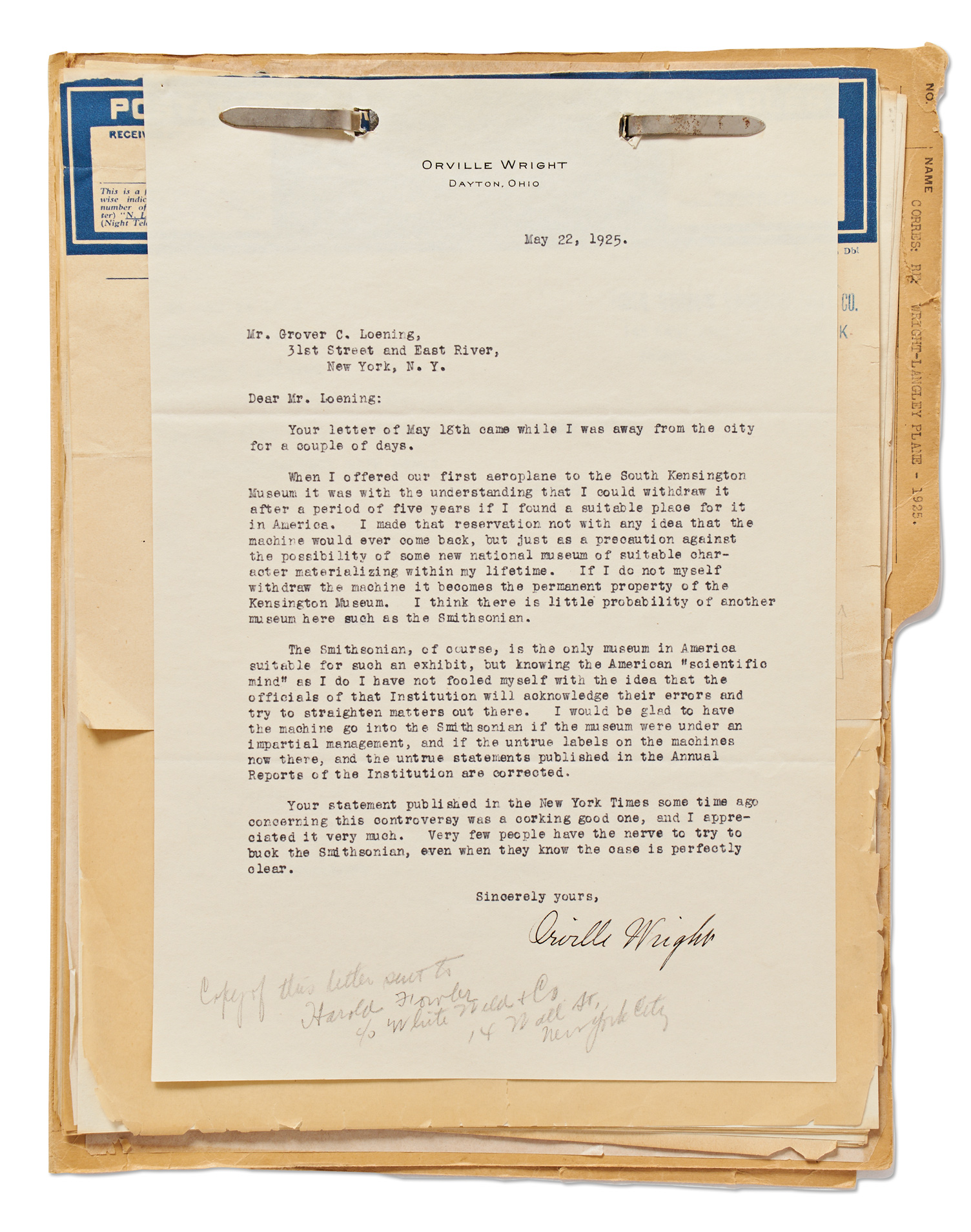 Several letters in the collection from 1925 concern the famous dispute between Orville Wright and the Smithsonian Museum, arising from the Museum’s reluctance to credit the Wright Flyer as the first flying machine. One of the first Secretaries of the Smithsonian, Samuel Langley, believed that he built the first plane capable of human flight, even though his plane failed several times to launch. In an almost comical series of letters between Wright, Loening, Charles Manly (representing the Langley estate), and Charles Walcott of the Smithsonian, proposals are made to restore the Langley machine — with Orville Wright fronting half the bill — to settle the question once and for all, a challenge which Wright politely declines. Other correspondence goes into great detail as to the language of the display should Wright donate the Flyer to the Smithsonian, as well as the reasons that Wright believed Langley’s plane was flawed. In one letter, Wright excoriates the Museum for failing to provide a secure environment for its valuable objects.