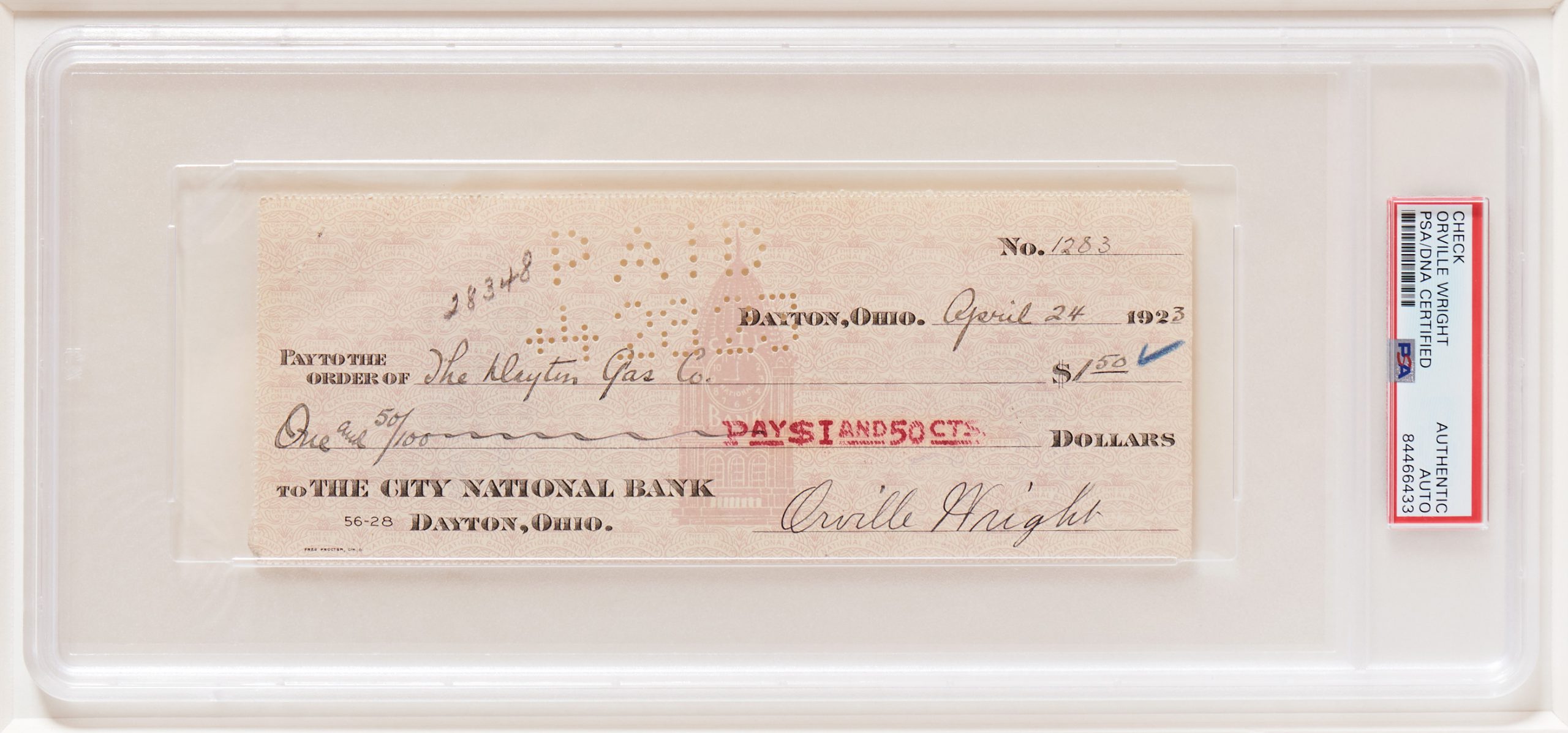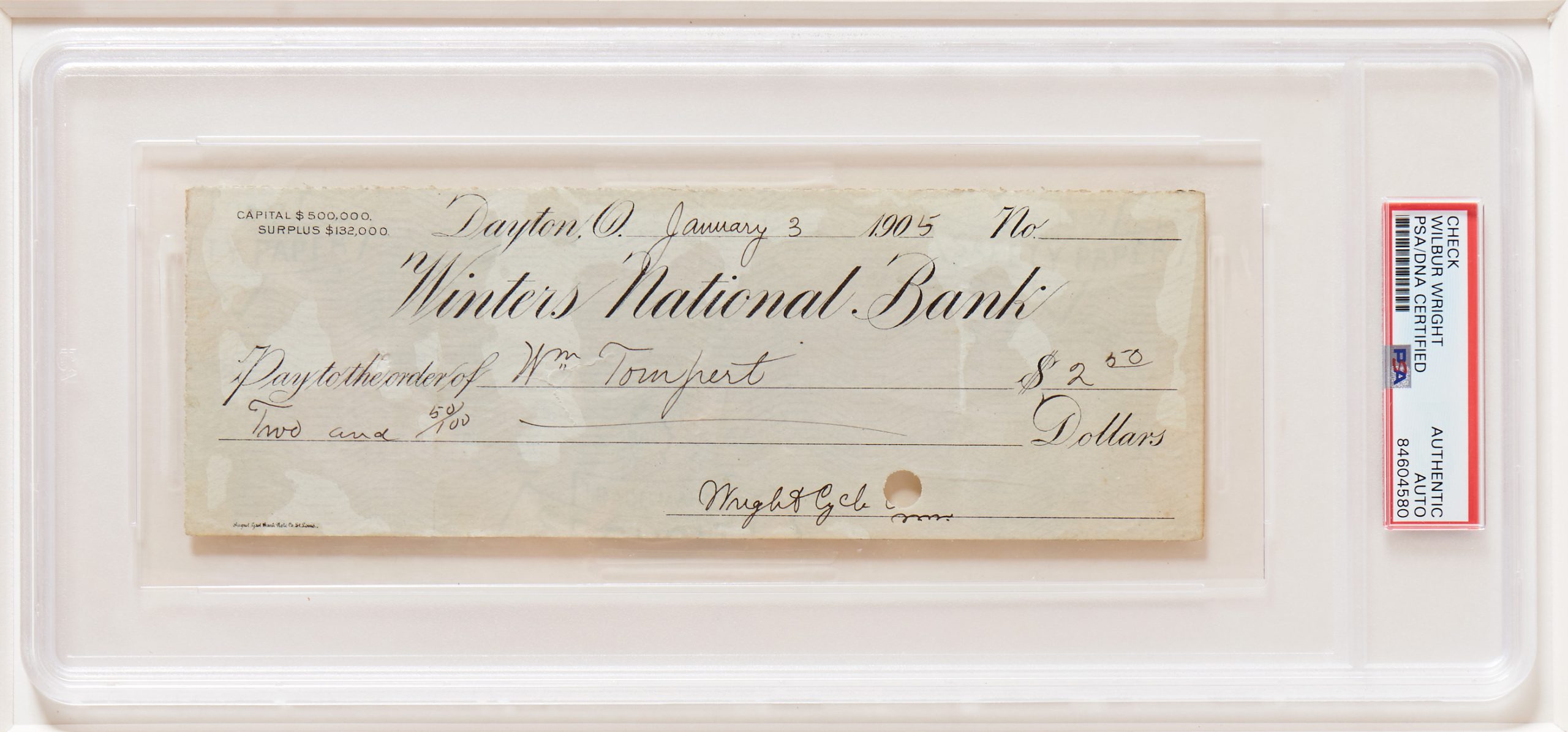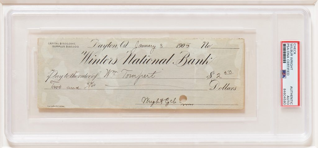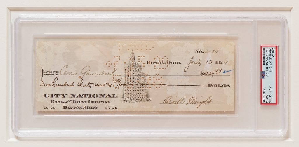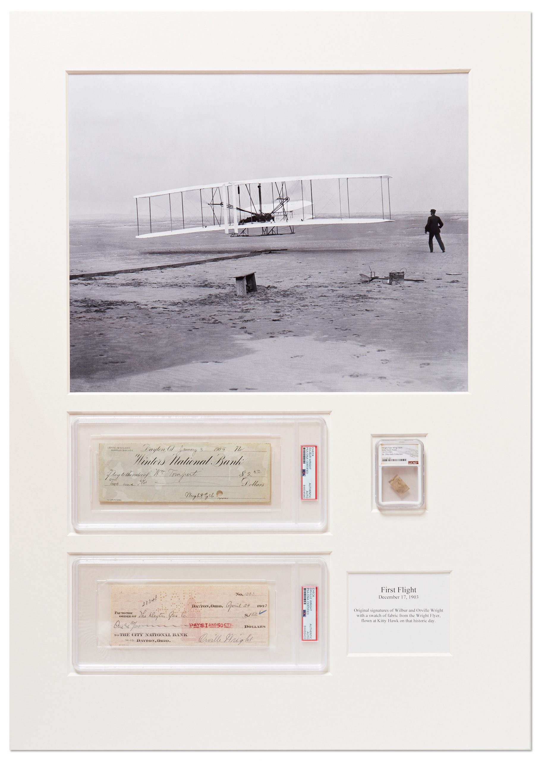 Wilbur & Orville Wright Checks Signed, Displayed with a Wright Flyer Fabric Swatch & 20″ x 16″ Photograph of the First Flight — Encapsulated by PSA/DNA & CAG