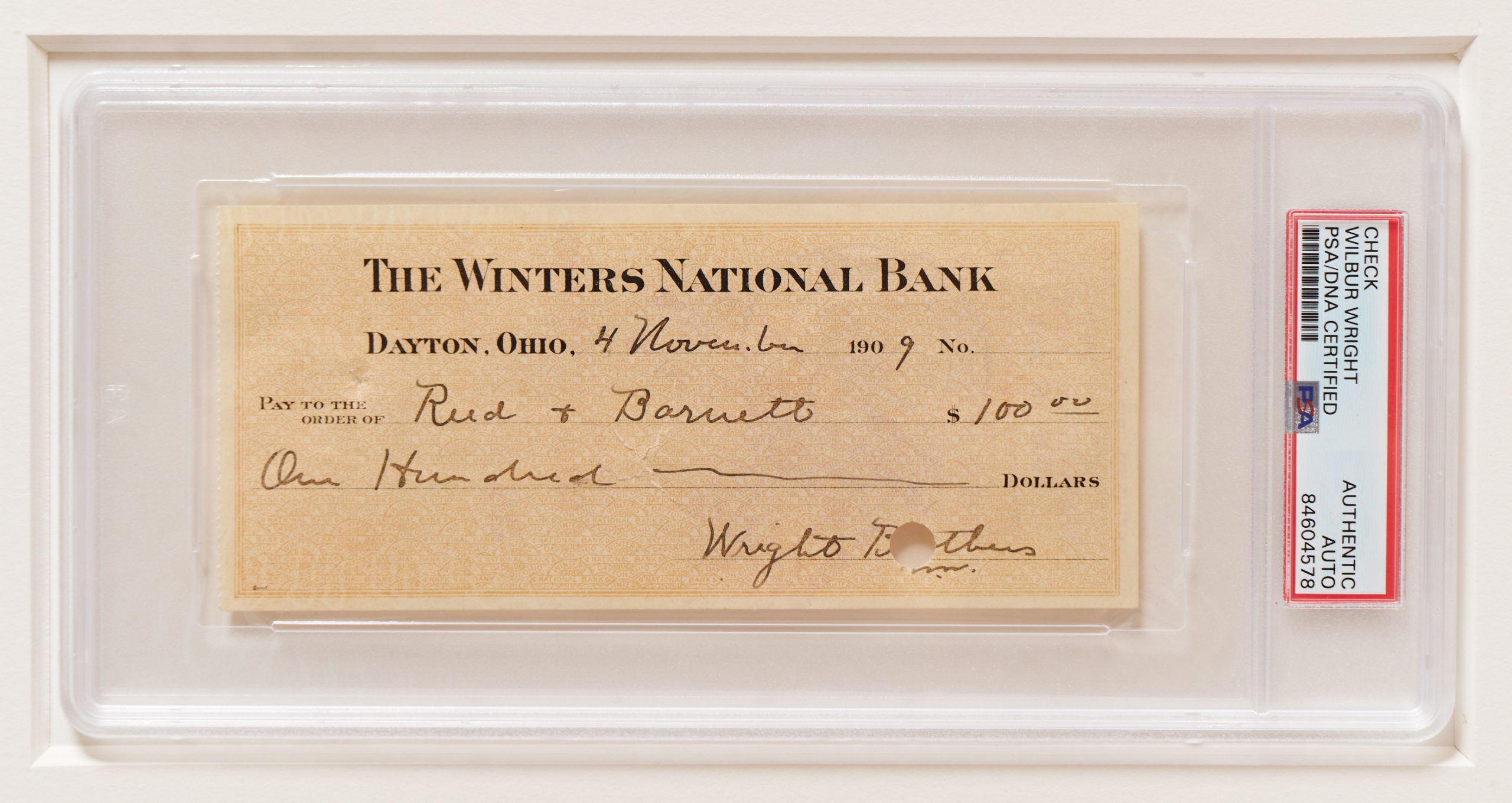 First check is signed by Wilbur Wright, who passed away in 1912, making his autograph quite rare. Composed entirely in his hand, Wright signs “Wright Brothers”, dates the check 4 November 1909 and handwrites the payee of Reed & Barnett for $100. Check measures 6.25″ x 2.75″, encapsulated by PSA/DNA to a size of 9.5″ x 4.5″. Block of toning and bank cancellation hole over the word Brothers, else near fine. Second check is elegantly signed “Orville Wright”, addressed in another hand to Carrie Grumbach on 13 July 1929 for $239.54. Check measures 9″ x 3.2125″, encapsulated by PSA/DNA to a size of 12.25″ x 5.625″. Small bank cancellation holes, not affecting signature. Very good plus condition. Display is completed with a fabric swatch from the Wright Flyer, measuring approximately .75″ x .625″ and encapsulated by CAG to a size of 2.25″ x 3.375″.