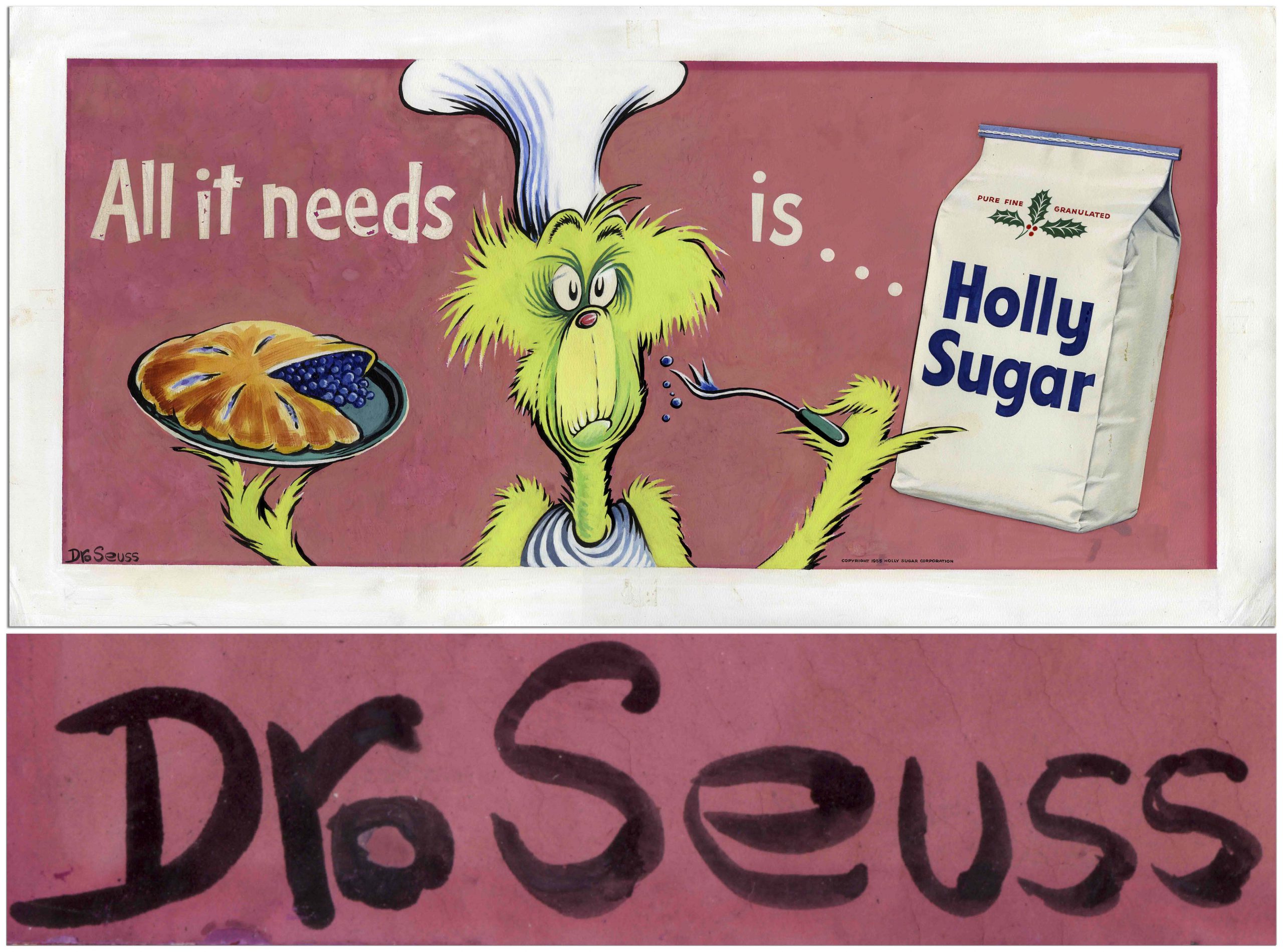 We realized $23,100 for Dr. Seuss advertising artwork from 1955 that features a Grinch-like character, two years before How the Grinch Stole Christmas! was published. Advertisement is for Holly Sugar, a prominent sugar manufacturer in the U.S. that sold sugar derived from beets. Artwork is mounted to board measuring 30 x 15 inches and includes title “Crazy Chef with Pie” on verso. Dr. Seuss signs lower left of artwork.
