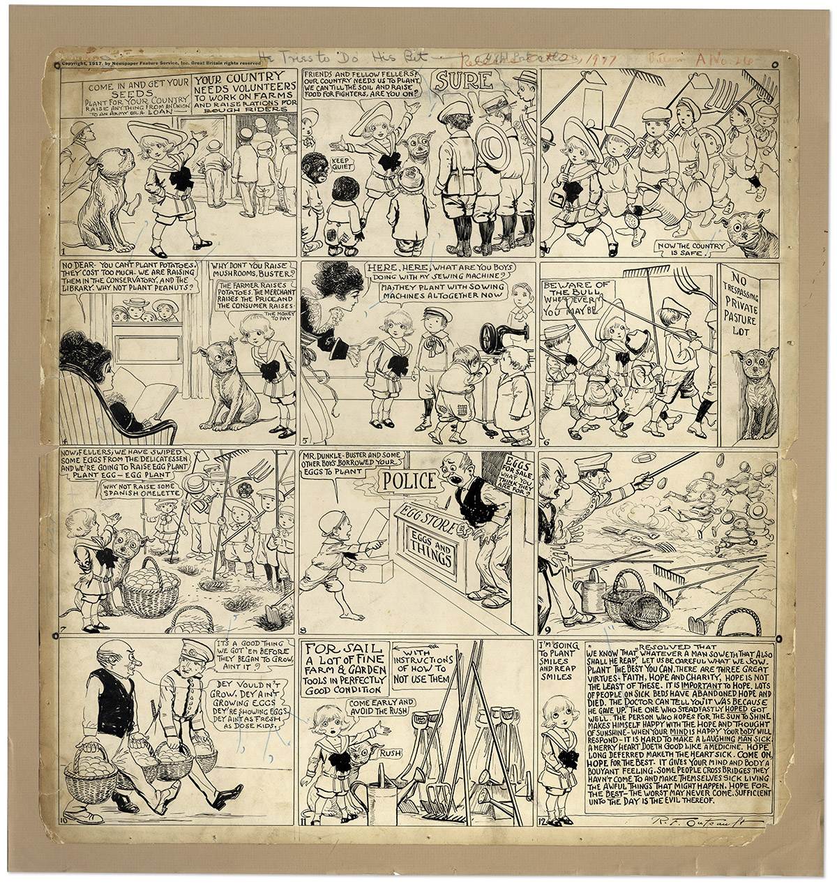 Large Sunday comic of ”Buster Brown” by Richard F. Outcault from 1917. In this installment, Buster and his dog Tige rally the neighborhood children to plant food rations for WWI ”Rough Riders”. Entitled ”He Tries to Do His Best”, Buster has good intentions, but plants eggs instead of ”eggplant” and uses his mother’s sewing machine to ”sow”. In the end, Buster resolves to always be hopeful. Strip is undated by likely from 21 October 1917 from writing at top. Newspaper Feature Service label is dated 1917. Comic measures 19.75” x 21”. Mounted on board, comic is chipped along edges but otherwise in very good plus condition. From the estate of ”Blondie” creator Chic Young. Sold for $10,000.