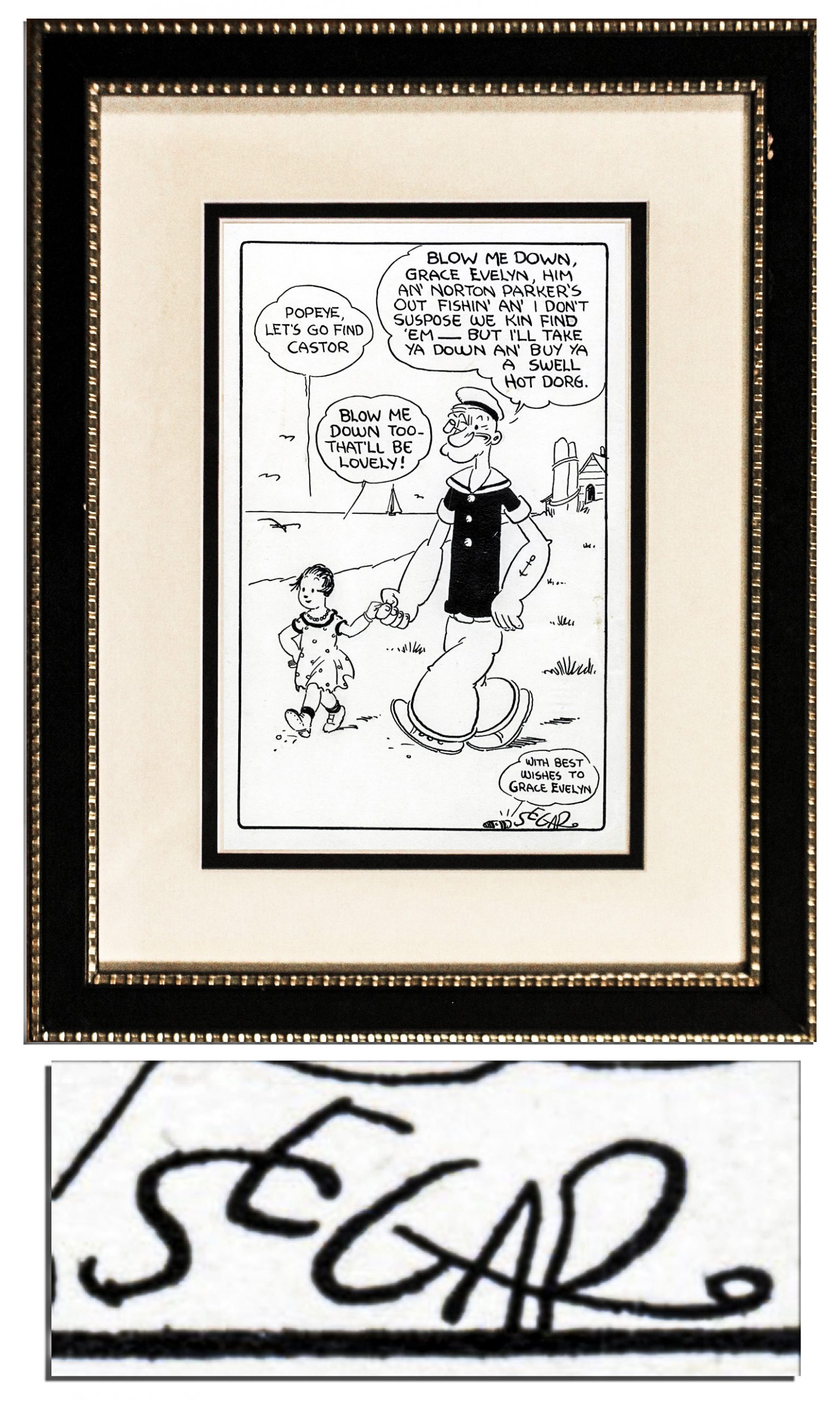 Original Elzie Segar ”Popeye” sketch, circa 1930’s. Popeye himself stars in the cartoon as he walks along the beach with a child. A speech bubble from him reads, ”Blow me down Grace Evelyn, him an’ Norton Parker’s out fishin’ an’ I don’t suspose we kin find ’em — But I’ll take ya down an’ buy ya a swell hot dorg”. Segar adds a speech bubble of his own at the lower right corner, ”With best wishes to Grace Evelyn” and signs, ”Segar”. Cartoon measures 6.5” x 9.5”. Framed to an overall size of approximately 12” x 10”. Unexamined out of frame but appears near fine. Sold for $3,125.